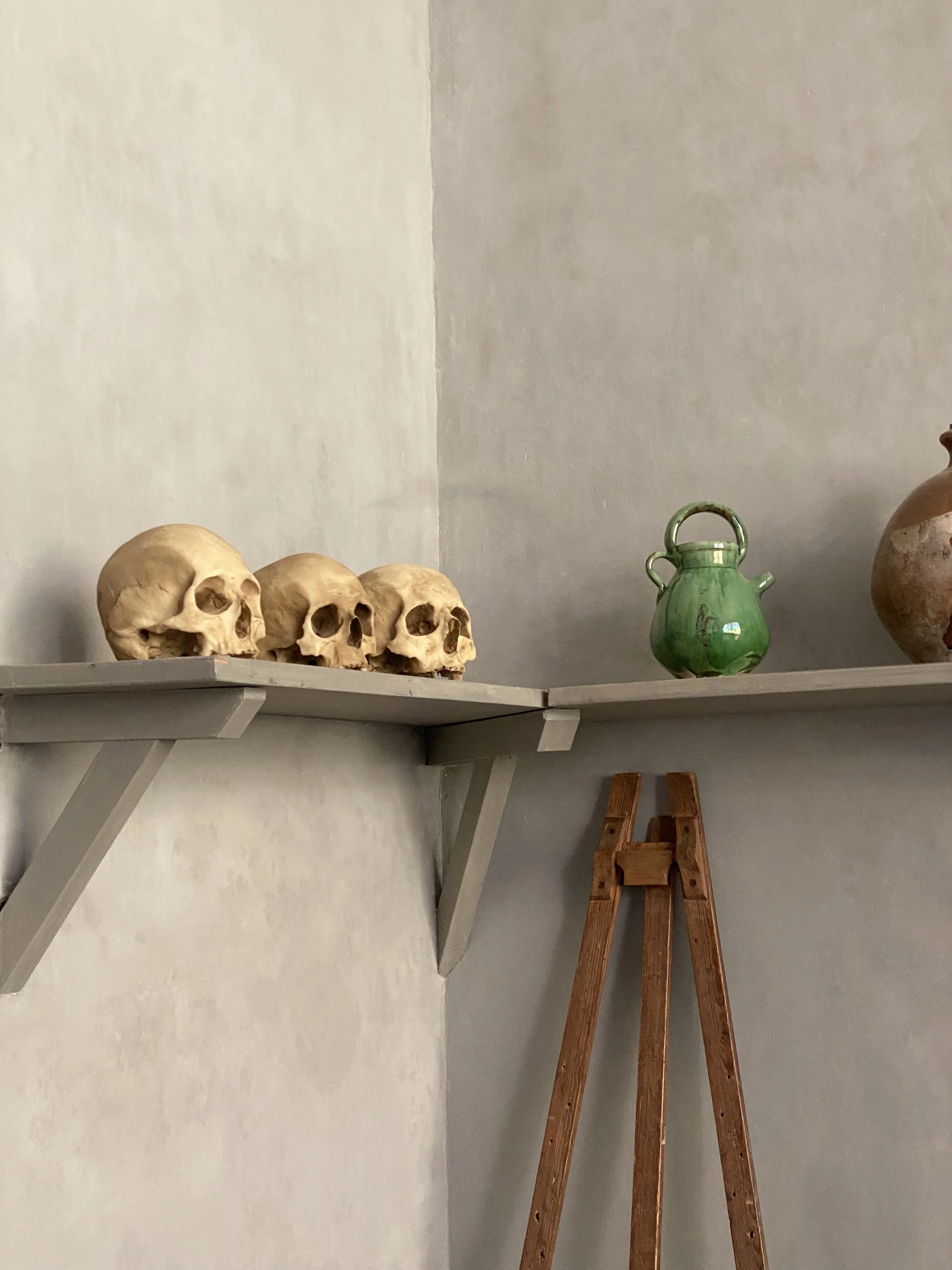 Dans l’atelier, des crânes, qui évoquent la fragilité de la vie humaine.