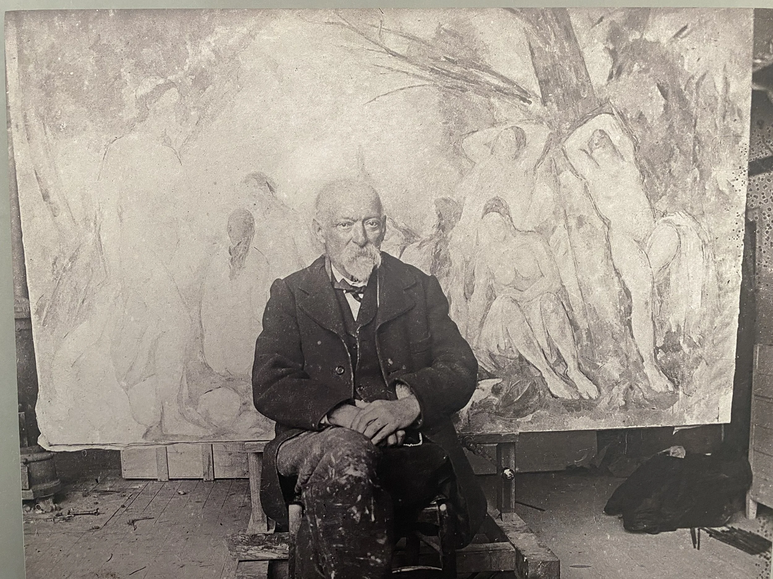 Paul Cezanne dans l’atelier des Lauves en 1905, devant ses grandes baigneuses. Ci-dessous, le mannequin articulé féminin qu’il a utilisé pour peindre ses baigneuses…