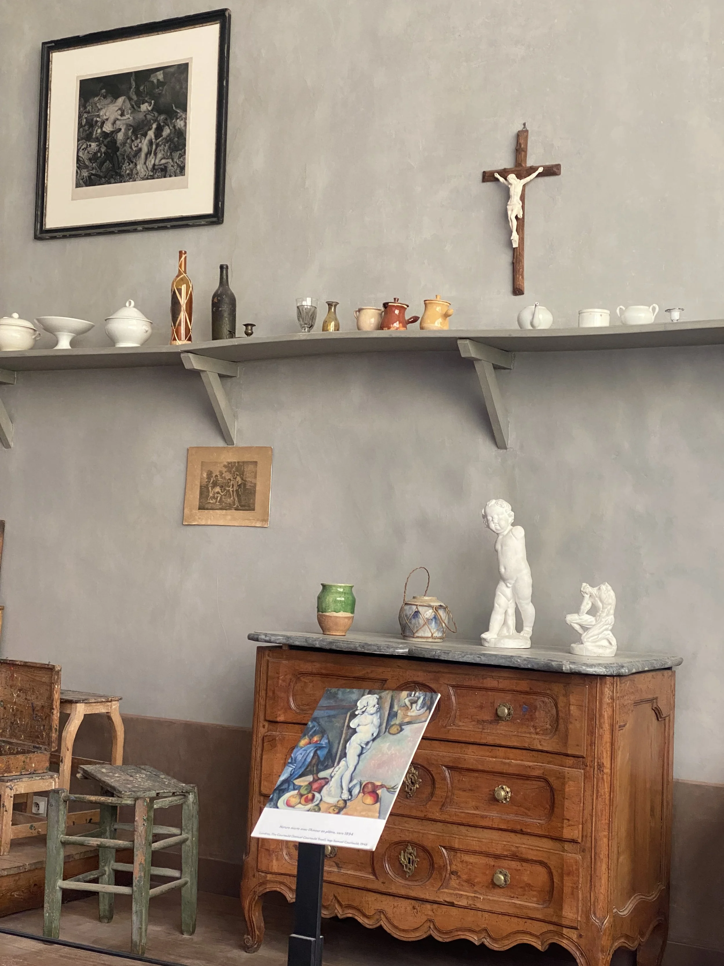 Après avoir vendu la propriété du Jas de Bouffan en 1899 (il était en indivision avec ses deux sœurs), c’est dans cet atelier que Cezanne a placé des objets provenant de l’ancienne propriété familiale, en particulier ceux qu’il représente dans ses natures mortes, comme l’angelot blanc, des jarres, des pots, des bouteilles, …