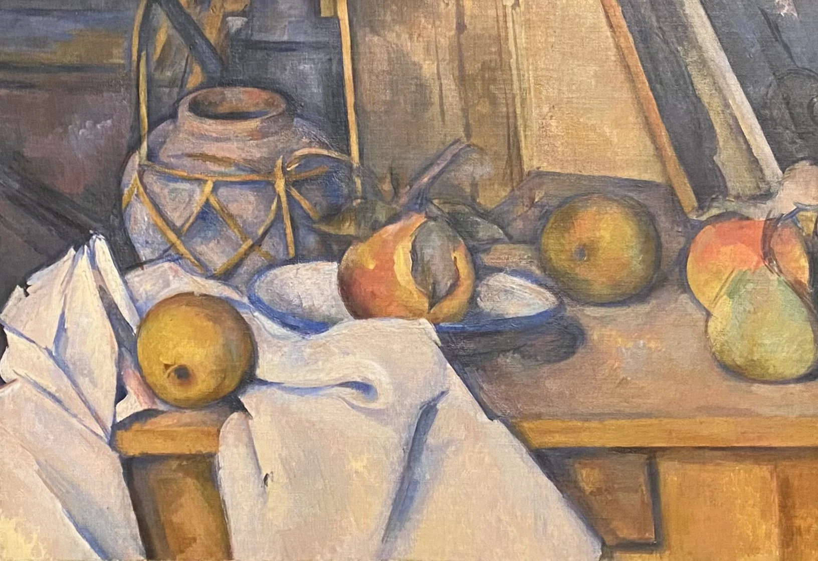 Dans les natures mortes exposées au Musée Granet, Cezanne a multiplié les points de vue. Ainsi, un pot à olives est représenté à la fois vu de profil et vu de haut ! On sait qu’il utilisait des pièces de monnaie, afin d’incliner ou rehausser certains objets. Cette démultiplication ouvre la voie au Cubisme, dont Braque et Picasso vont faire un mouvement d’avant-garde…