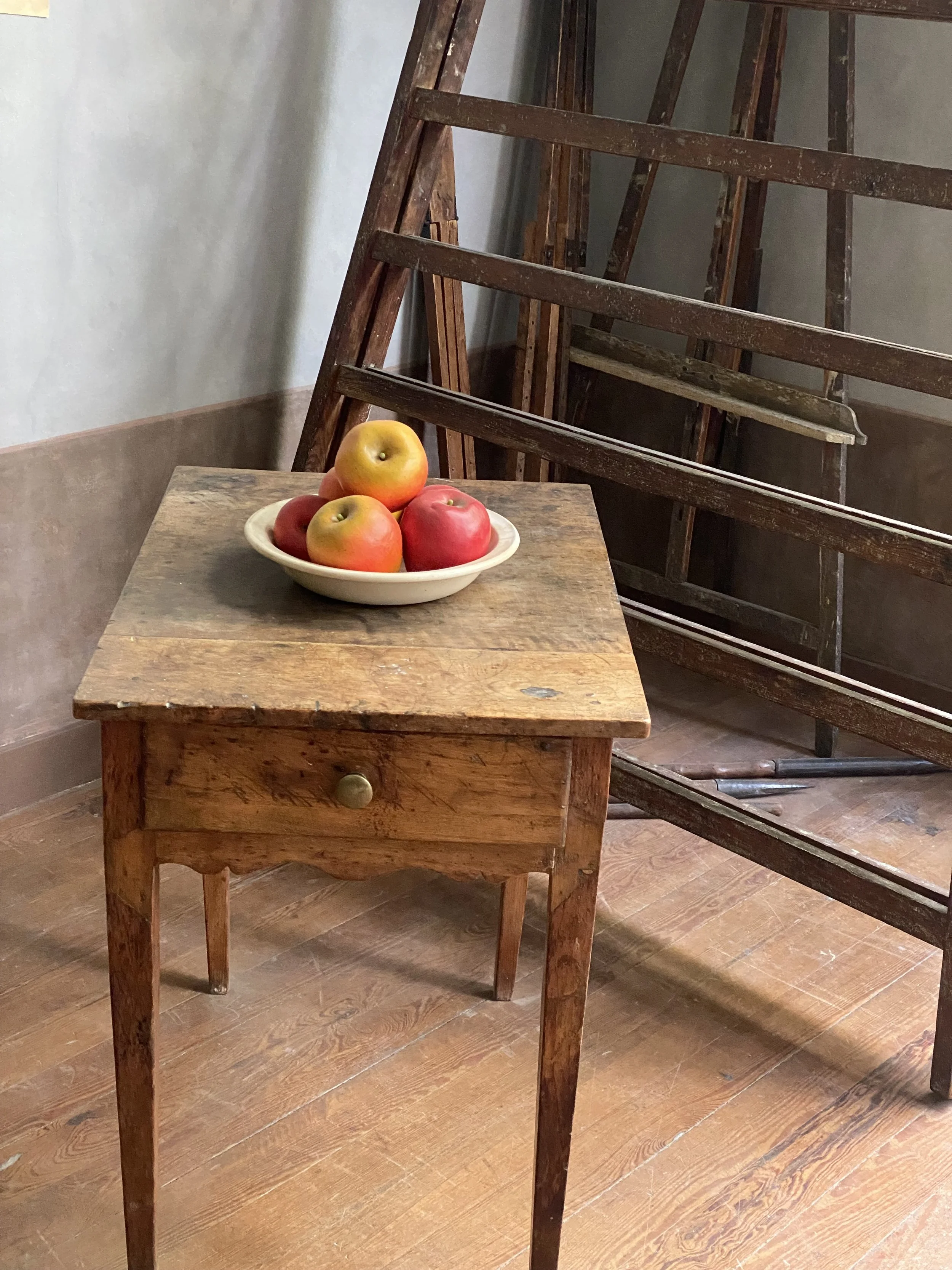 Ci-dessous, une immense échelle à ramasser les olives ! La propriété était complantée d’oliviers, jusqu’au gel de 1956. Cette échelle fut utilisée par les peintres auxquels Cezanne demanda de peindre les hauts murs de l’atelier en gris, et par lui-même pour regarder ses grandes toiles en prenant de la hauteur…