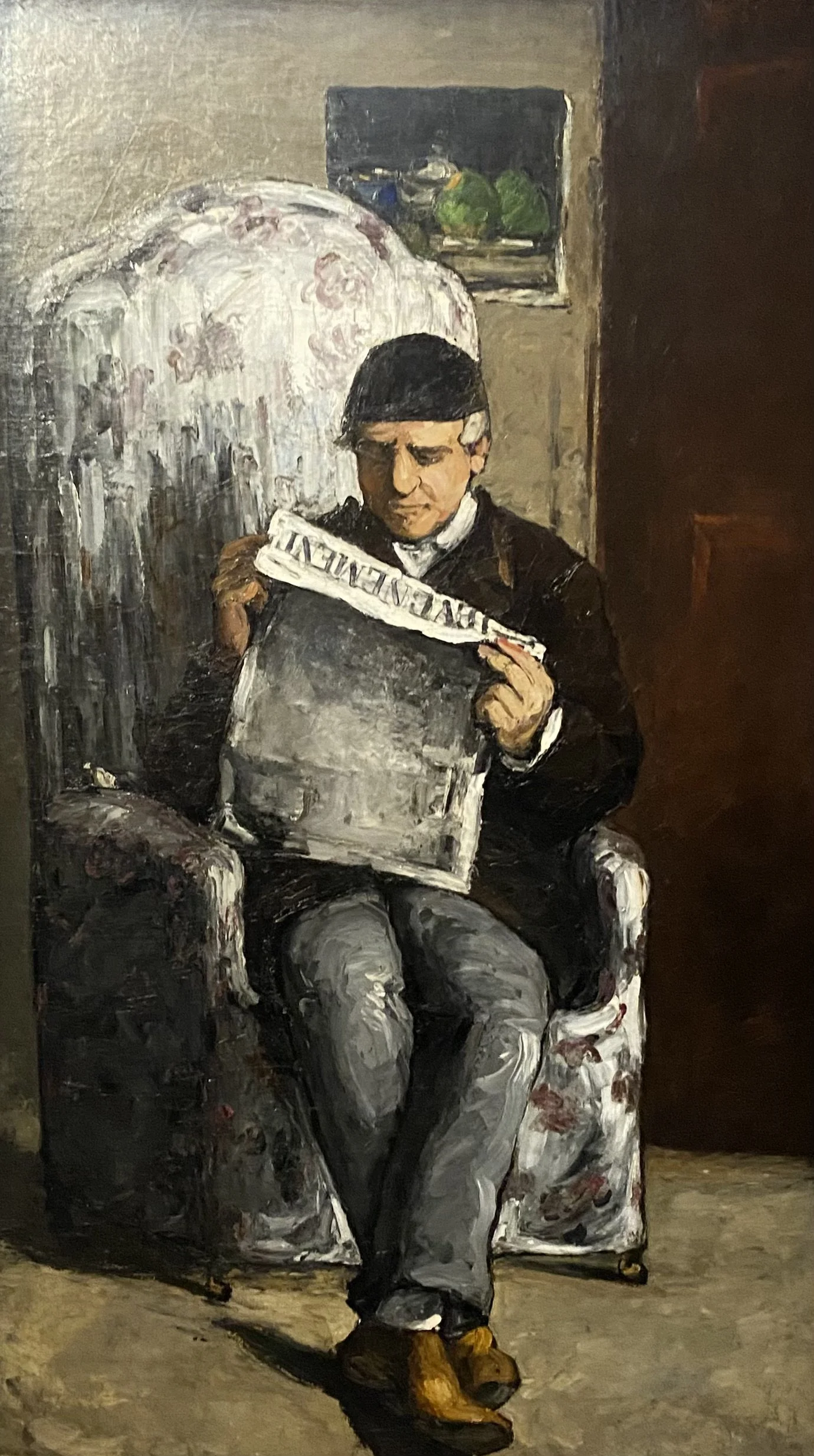 Cezanne signe le portrait de son père en utilisant le nom d’un maître connu, Ingres, pour lui prouver que lui aussi veut être peintre. Cezanne est présent dans ce tableau avec sa petite nature morte accrochée derrière son père, laquelle est d’ailleurs présentée dans l’exposition tout à côté. Et Emile Zola est présent aussi, puisqu’il écrit dans le journal L’Évenement (et défend les Impressionnistes), que Louis Cezanne lit ! Ce grand tableau (198x119 cm) de 1866 est prêté par la National Gallery, Washington, D.C. Personne ne comprenait le peintre ! Pour ce tableau, il a utilisé un couteau à palette, c’est-à-dire une mini-truelle servant habituellement à mélanger les couleurs sur la palette ; la peinture est donc empâtée, vigoureuse.