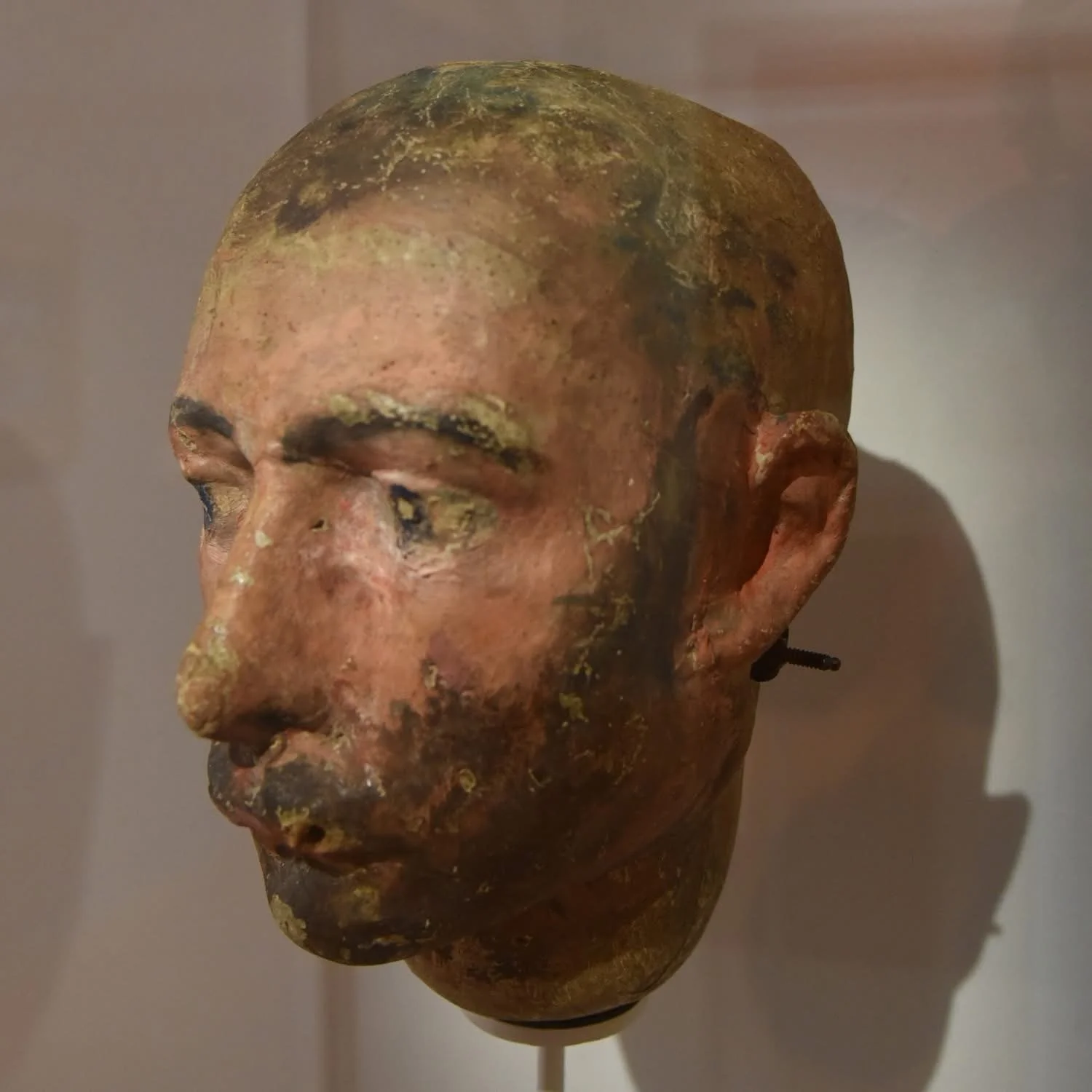 Tête de mannequin, grandeur nature, en carton-pâte, qui devait compléter un corps rempli de paille ou de son. Au niveau de la bouche, un trou permettait sans doute à Paul Cezanne de fixer une pipe. Et comme le peintre travaillait lentement, le mannequin remplaçait facilement de longues heures de pose … Collection particulière. Photo © DR Musée Granet.