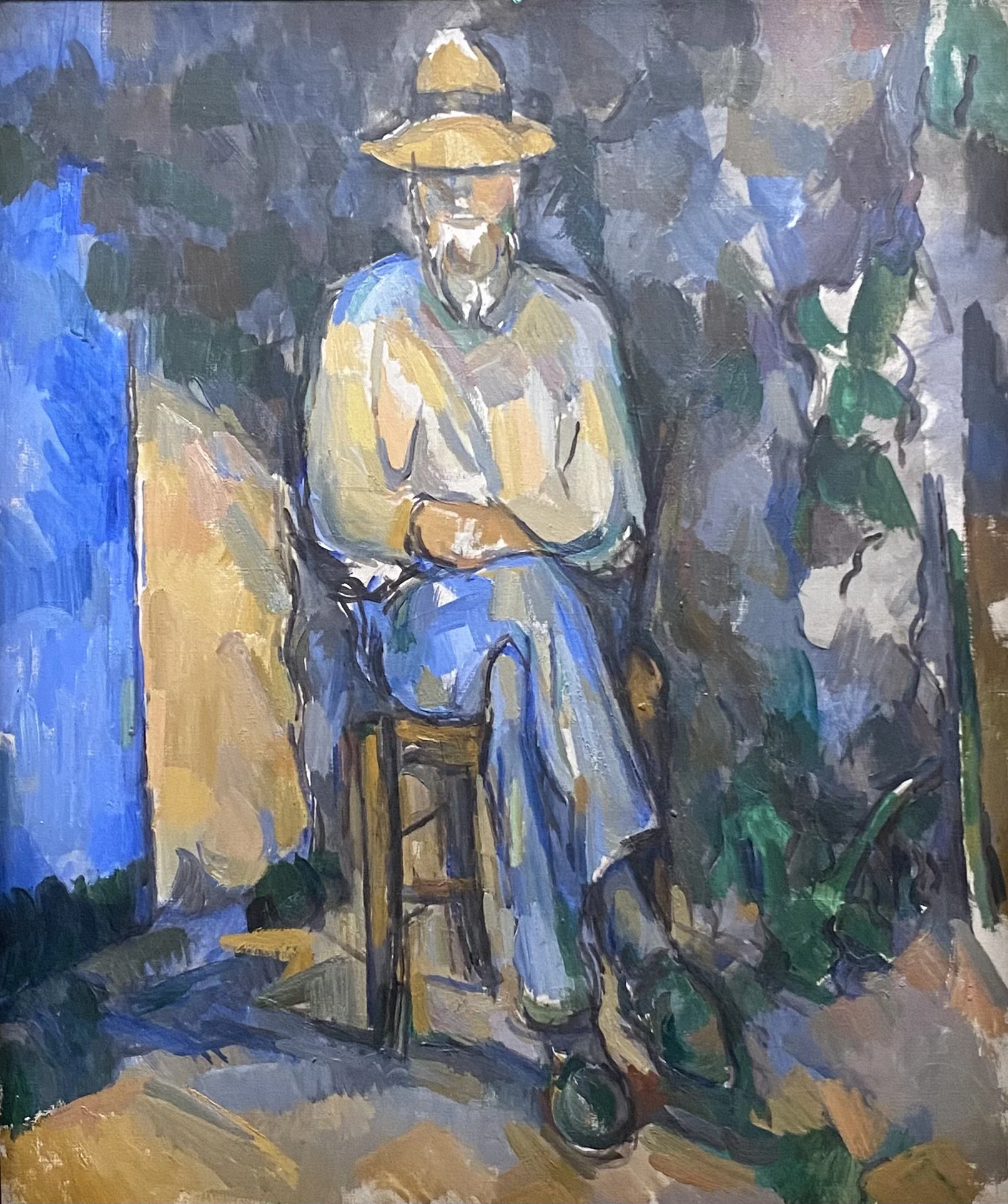 Au Jas de Bouffan, Cezanne peint également les paysans qui travaillaient dans la ferme du domaine, comme ici le paysan en blouse bleue (1895-1897), prêté par le Kimbell Museum de Fort Worth, Texas, et qui est peut-être aussi l’un des joueurs de cartes, ce qui est aussi le cas de l’homme à la pipe (1890-1892), qui vient du Nelson-Atkins Museum de Kansas City, Missouri, et le paysan assis (vers 1900) du Musée d’Orsay.