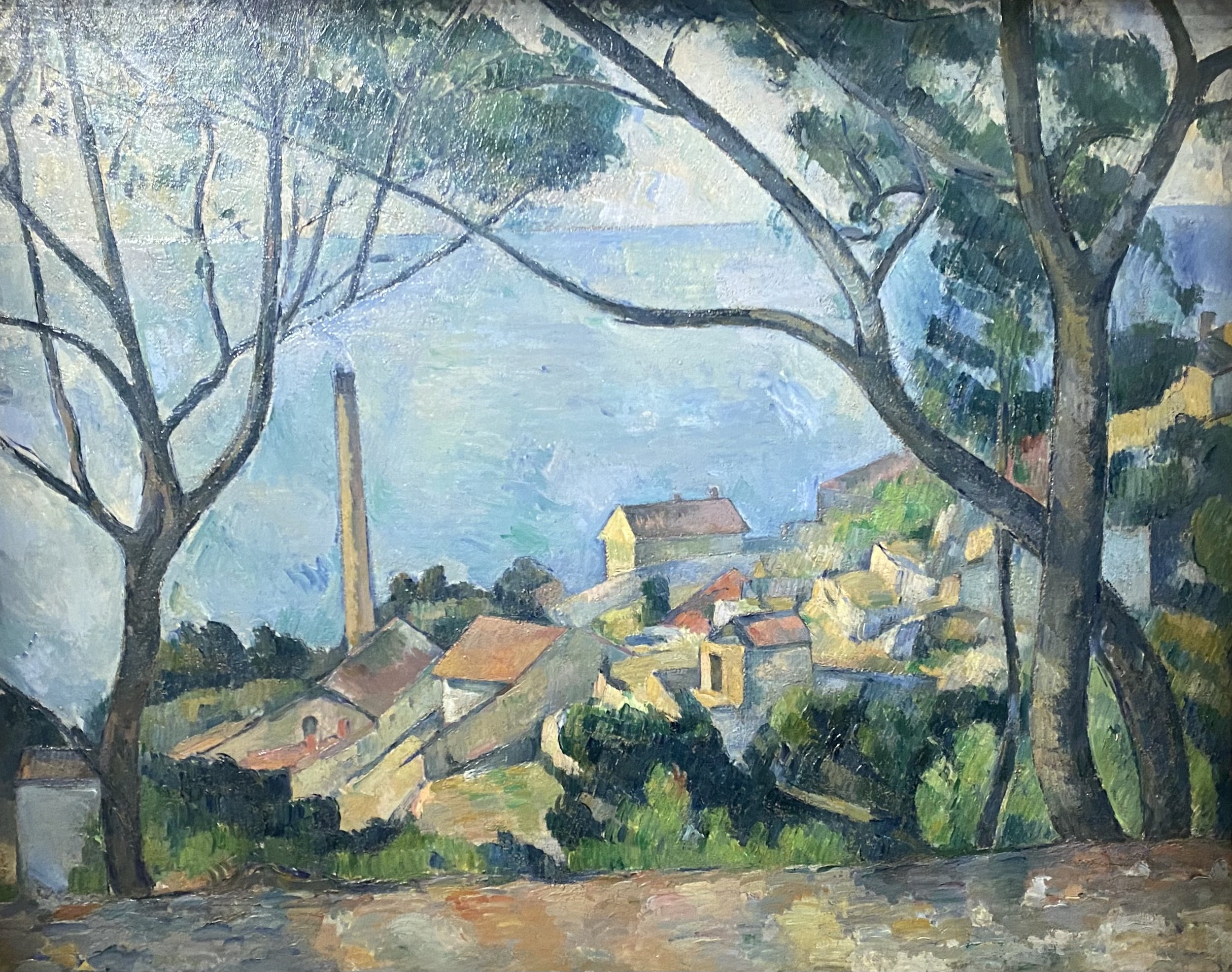 Cezanne a également séjourné au bord de la Méditerranée : ici, La mer à l’Estaque (1877-1878), une toile prêtée par le musée national Picasso de Paris. Seul ou avec son épouse et son fils, il aime ce petit port de pêche où l’on trouvait des manufactures (la cheminée !). Pablo Picasso possédait plusieurs tableaux de Cezanne, et celui-ci était l’un de ses préférés : Cezanne, notre maître à tous, disait-il. La ligne d’horizon chez Cezanne n’est pas souvent droite, une caractéristique de son art. D’autres peintres vont se rendre à L’Estaque après Cezanne et en faire un foyer de la peinture moderne, notamment avec Georges Braque en 1906 : après le Fauvisme, le Cubisme est né !