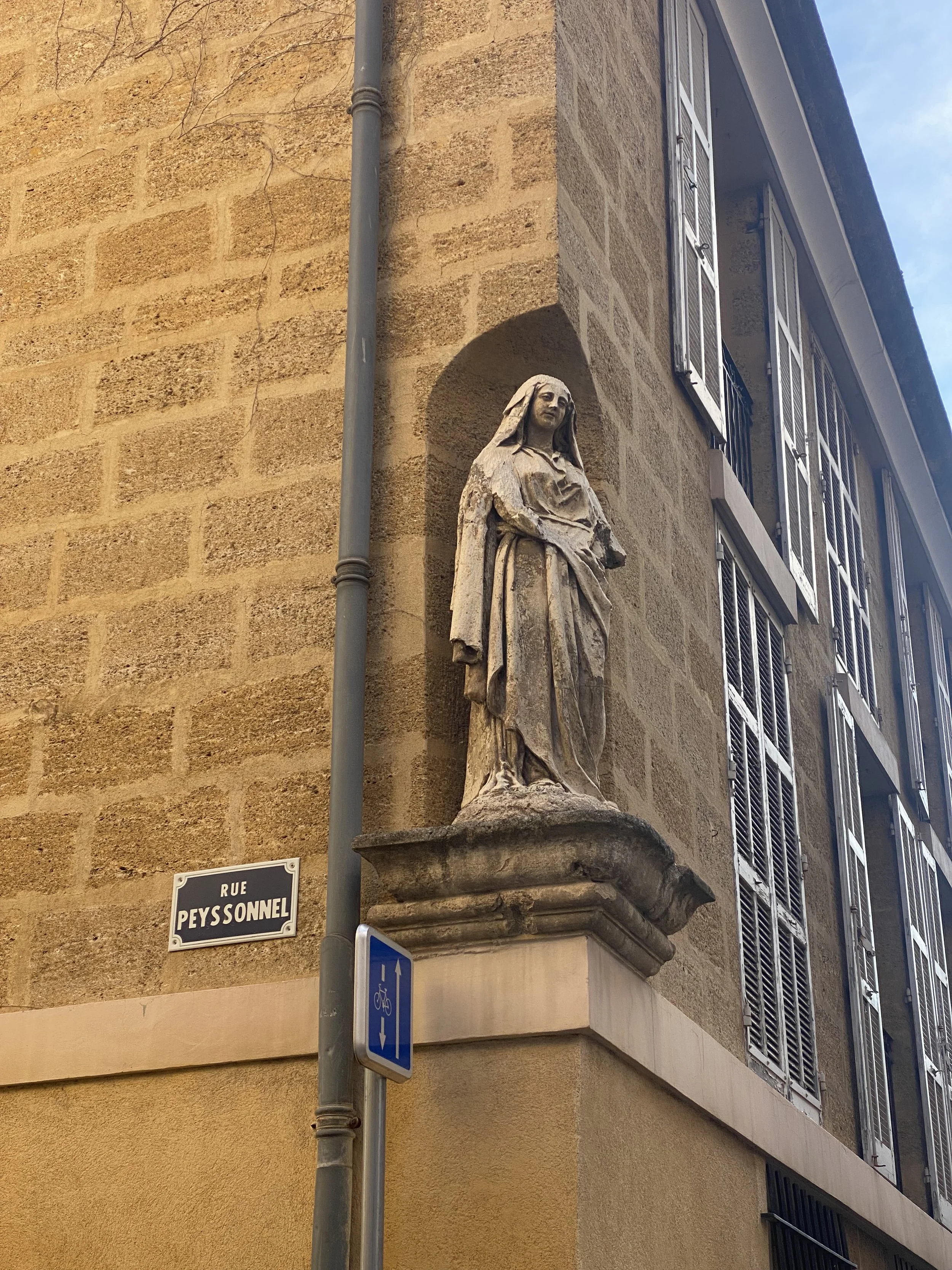 Un des nombreux oratoires d’Aix-en-Provence, à l’angle de la rue Roux-Alphéran. Celui-ci est dédié à la Vierge, d’autres le sont à des saints, souvent pour protéger les Aixois de la peste, des épidémies ou de la sécheresse. À Aix, on compte environ 60 oratoires et une trentaine de niches vides. On pouvait y prier tout le temps par exemple pendant les épidémies quand les églises étaient fermées.