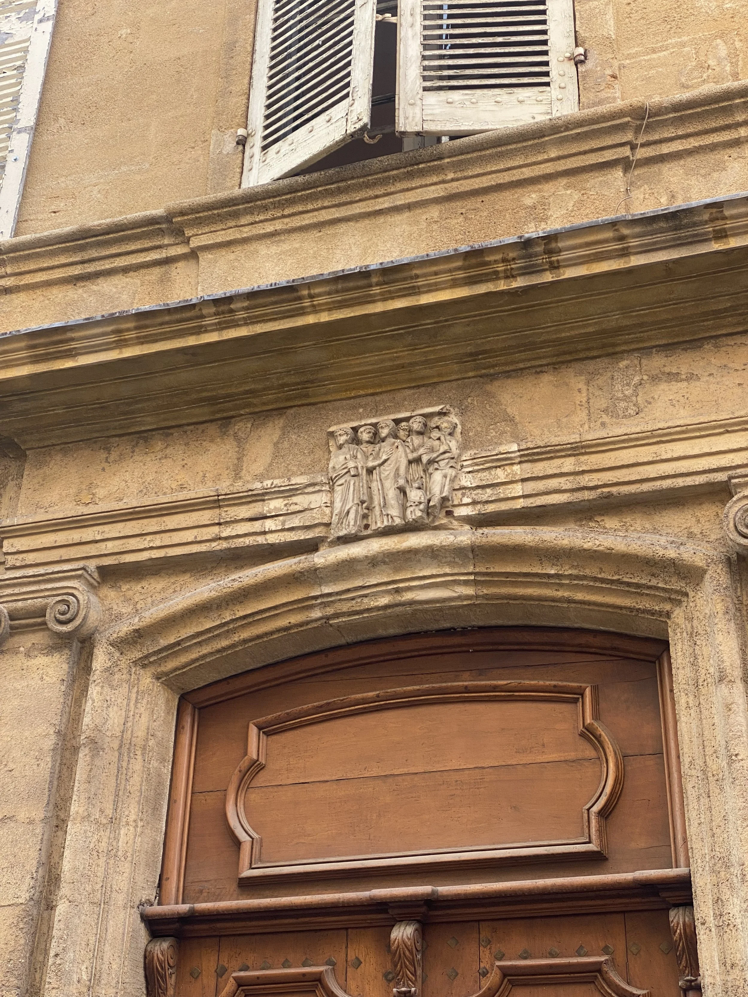 Hôtel Ripert de Monclar, 35, rue Roux-Alphéran : un fragment de sarcophage chrétien, une des surprises que réserve ce quartier, quand on observe les détails de l’architecture. La rue porte le nom de l’un des principaux historiens de la ville.