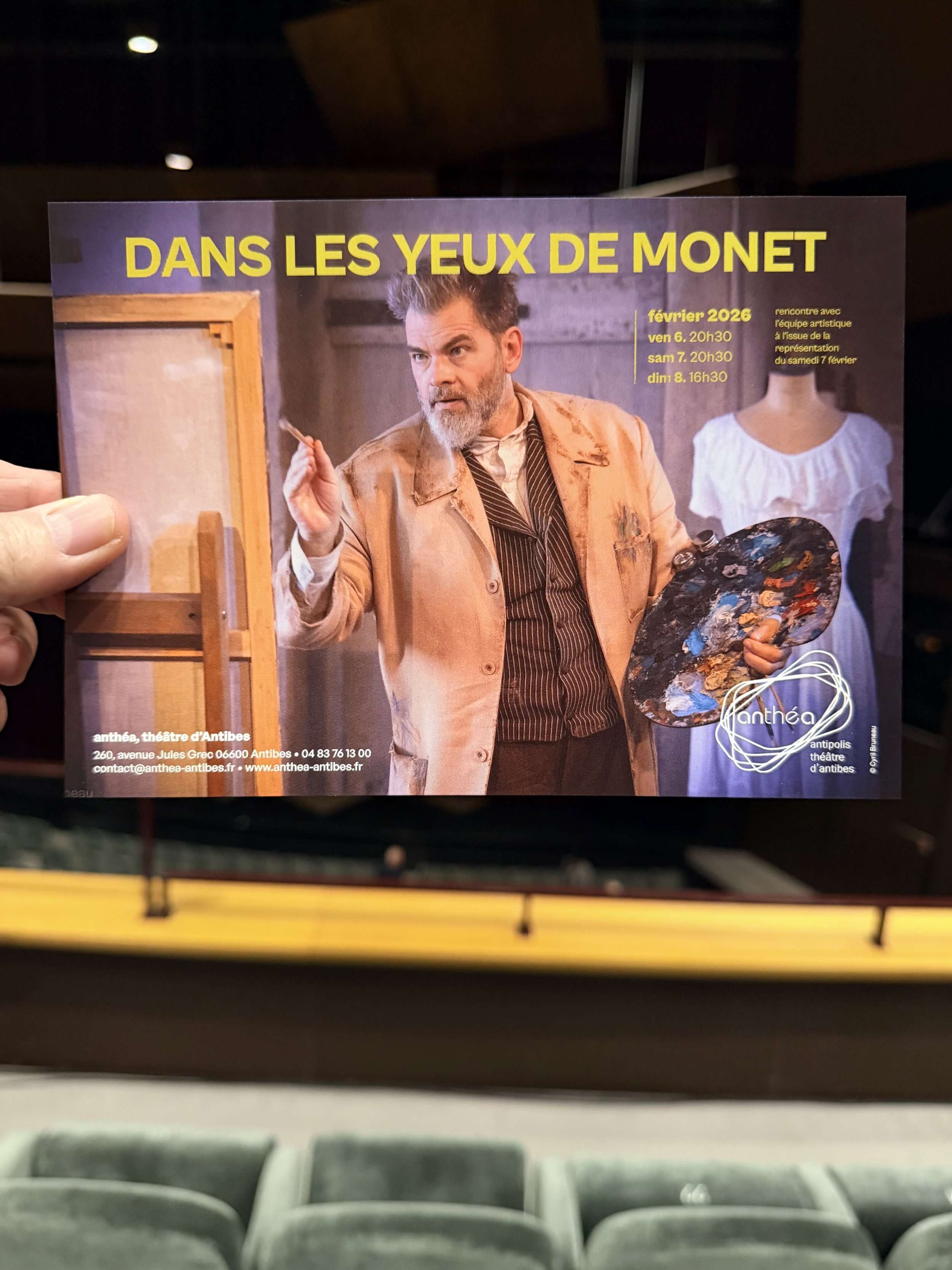 À Anthea Antibes, le 6 février 2026. Dans la ville peinte par Monet en 1888, l’excellente pièce de Cyril Gély, dans laquelle Clovis Cornillac interprète un Claude Monet tourmenté, Maud Baecker sa merveilleuse muse imaginaire, et Éric Prat son marchand Paul Durand-Ruel.