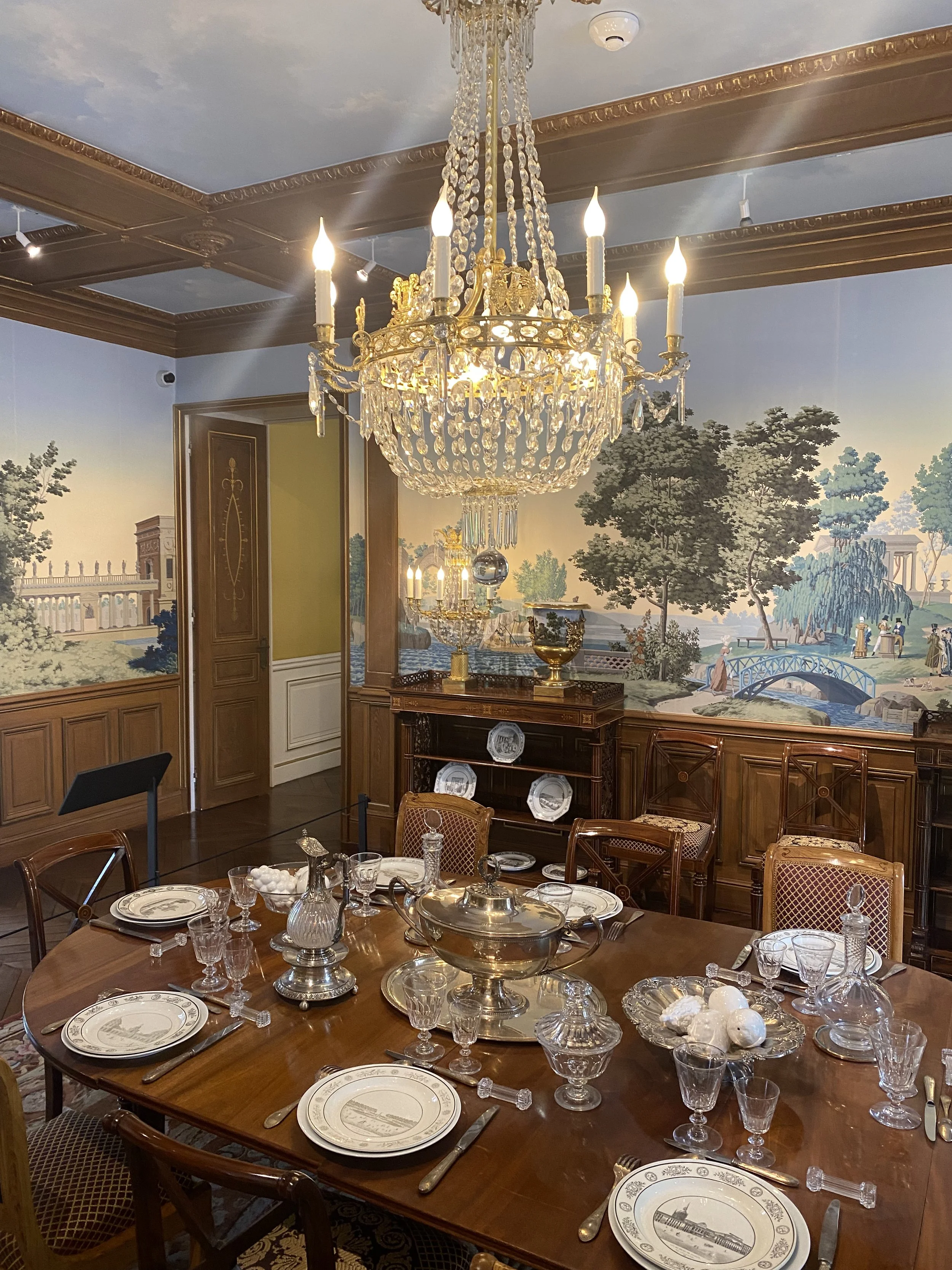 La maison est remeublée comme ici la salle à manger de la famille Caillebotte, dont les murs sont ornés d‘une réédition, par la manufacture alsacienne de papiers peints Zuber, des „Jardins français“.