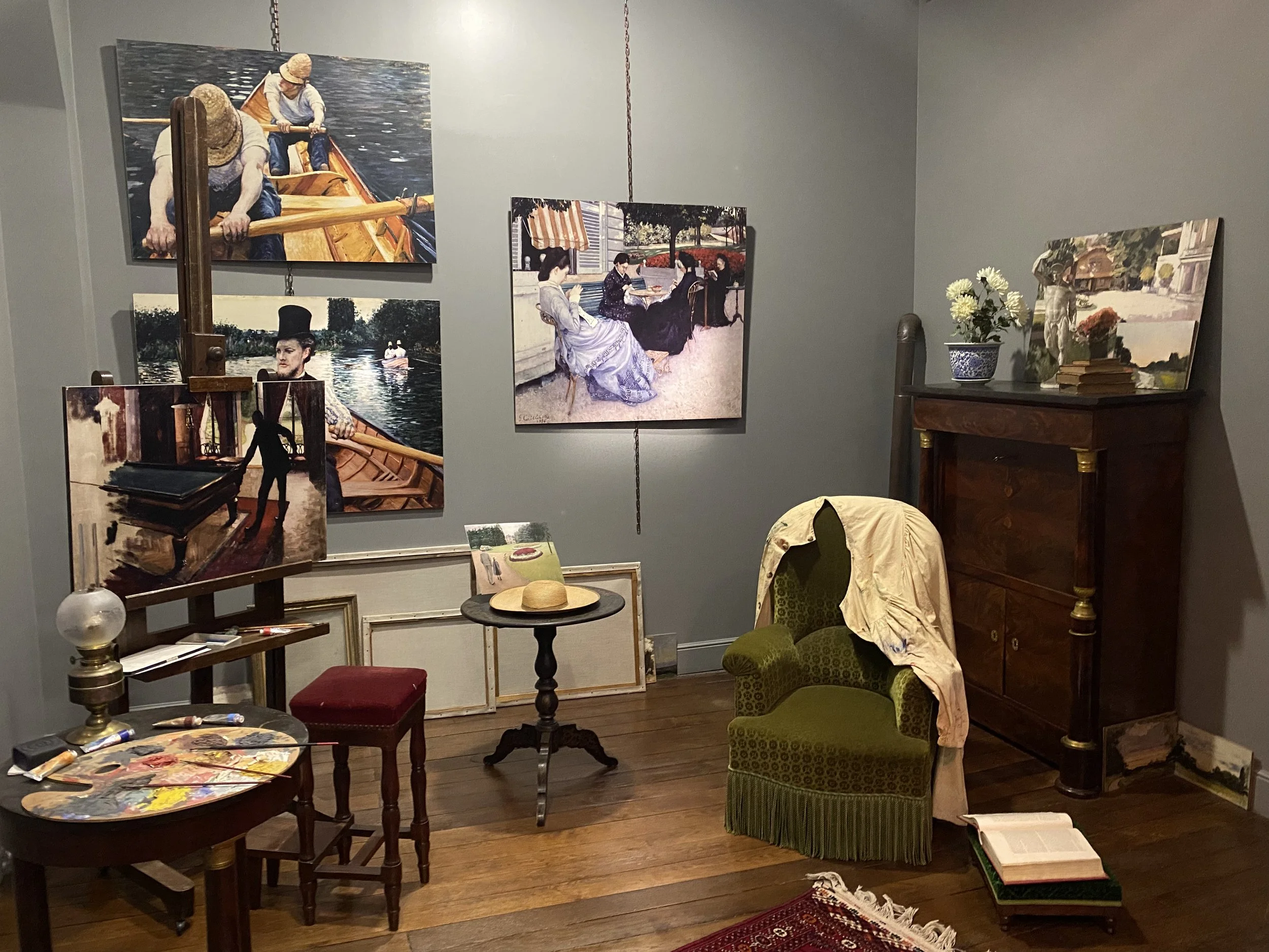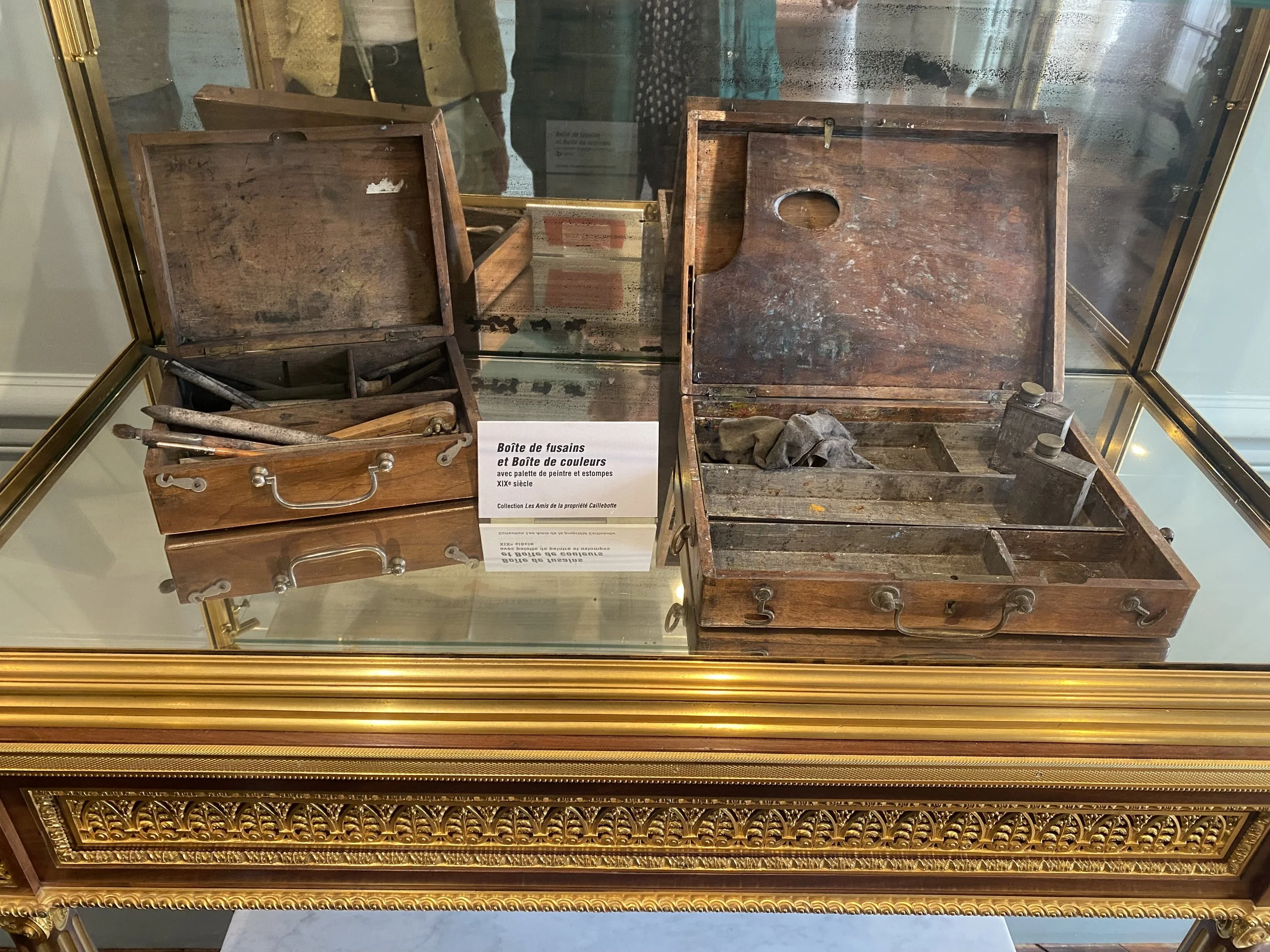 On a également tenté de reproduire l’atelier de Caillebotte, comme ici, au second étage. Le premier propriétaire de la maison, le cuisinier Pierre-Frédéric Borrel, avait fait construire cet atelier d’artiste. Ci-dessous, les palettes de Gustave Caillebotte.
