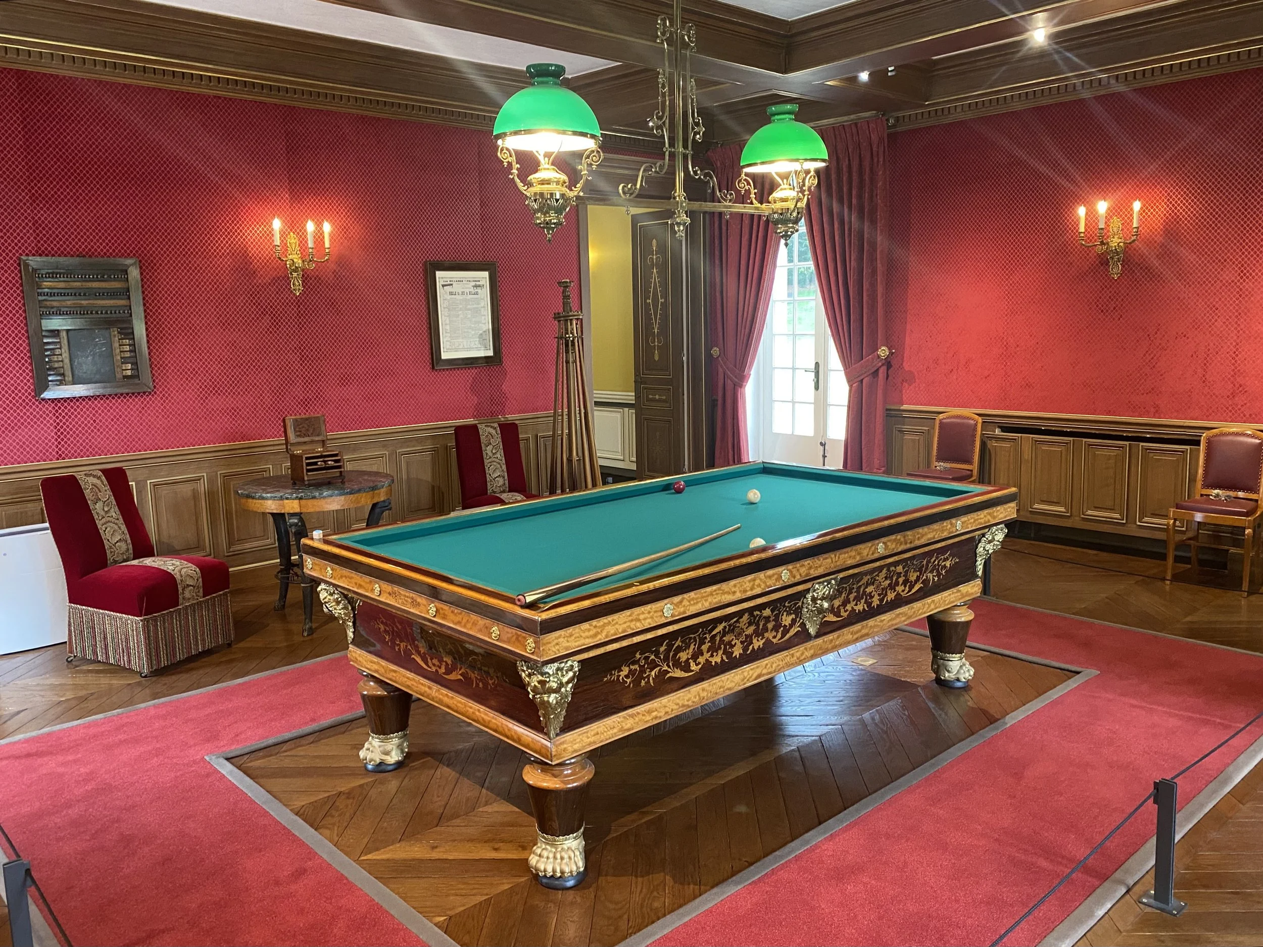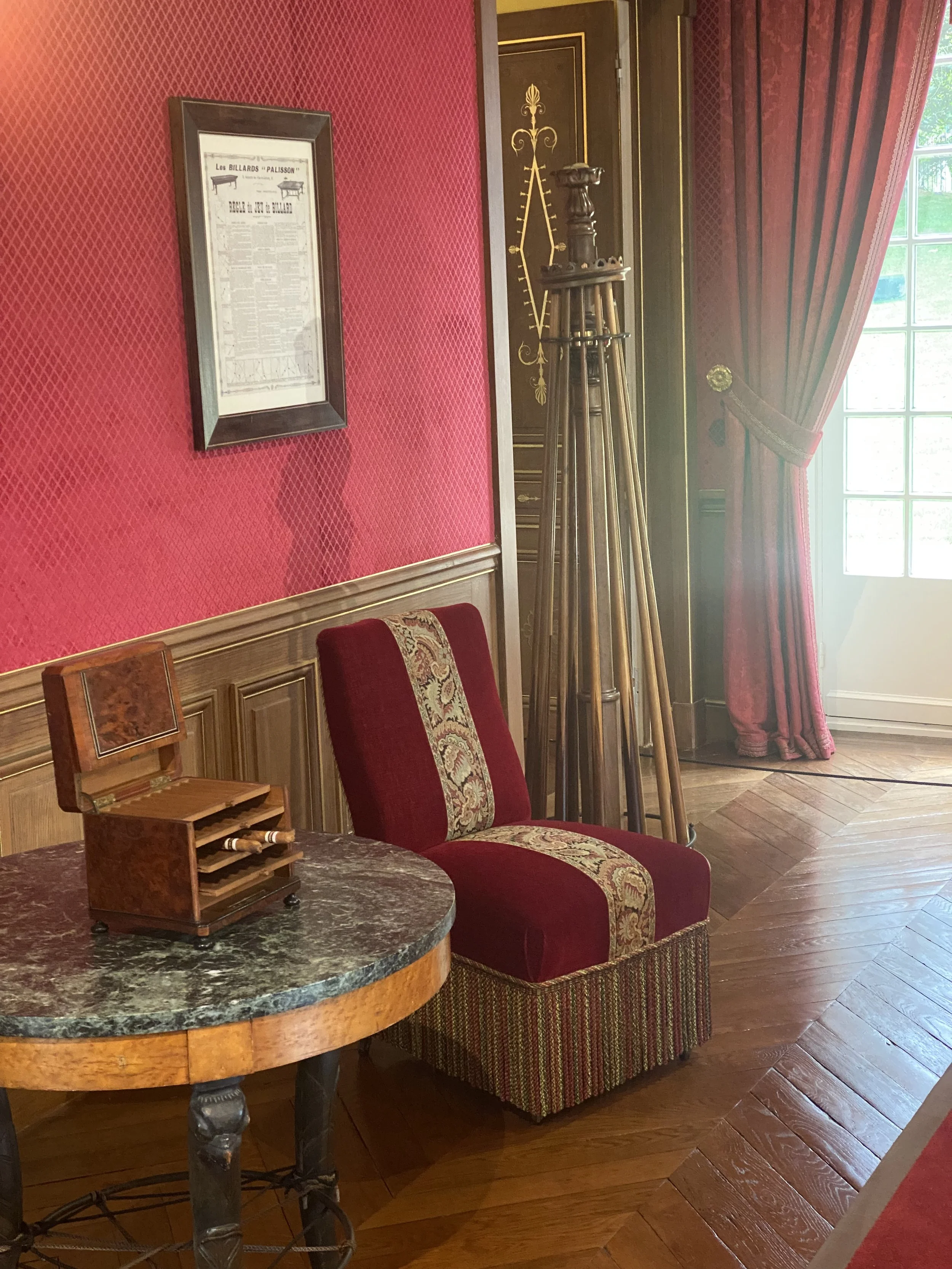 Ici la salle de billard, pour les messieurs, donnant sur le parc, et la reproduction d’un tableau inachevé (Le billard, 1875, collection particulière), qui a permis de restituer le décor initial.