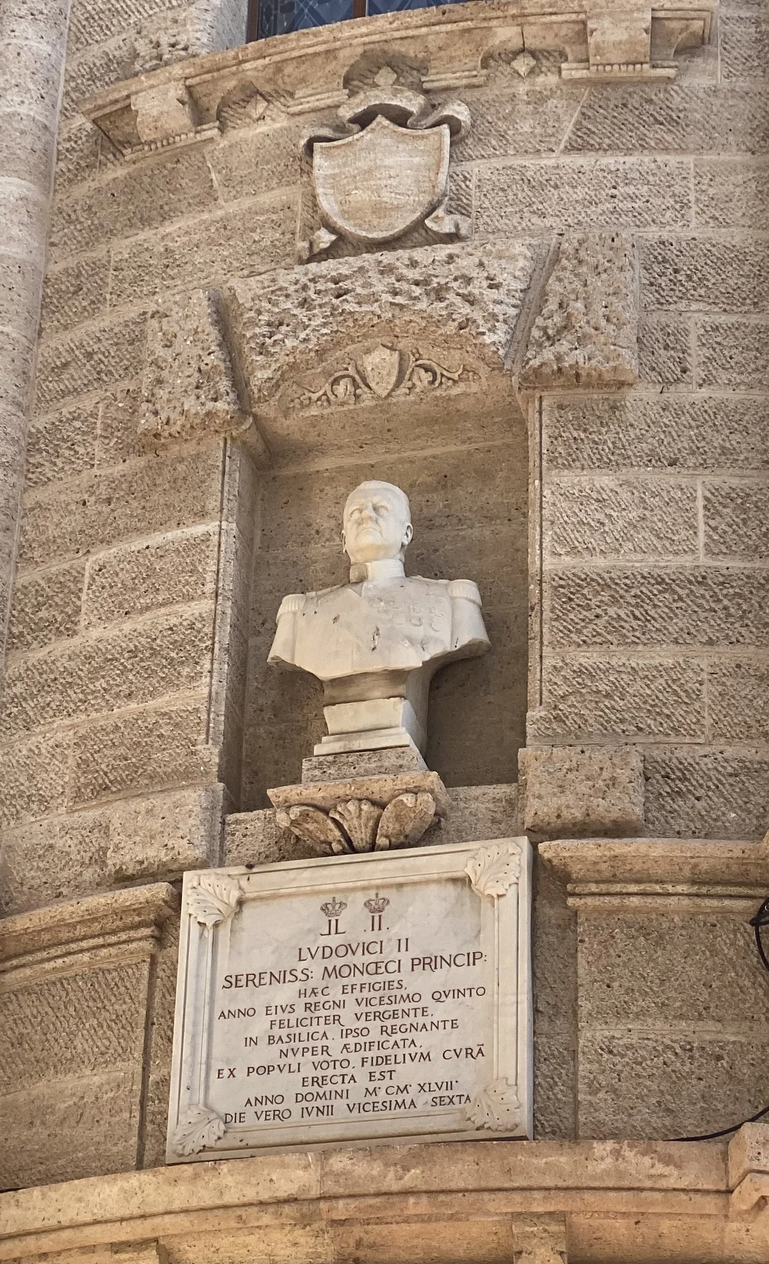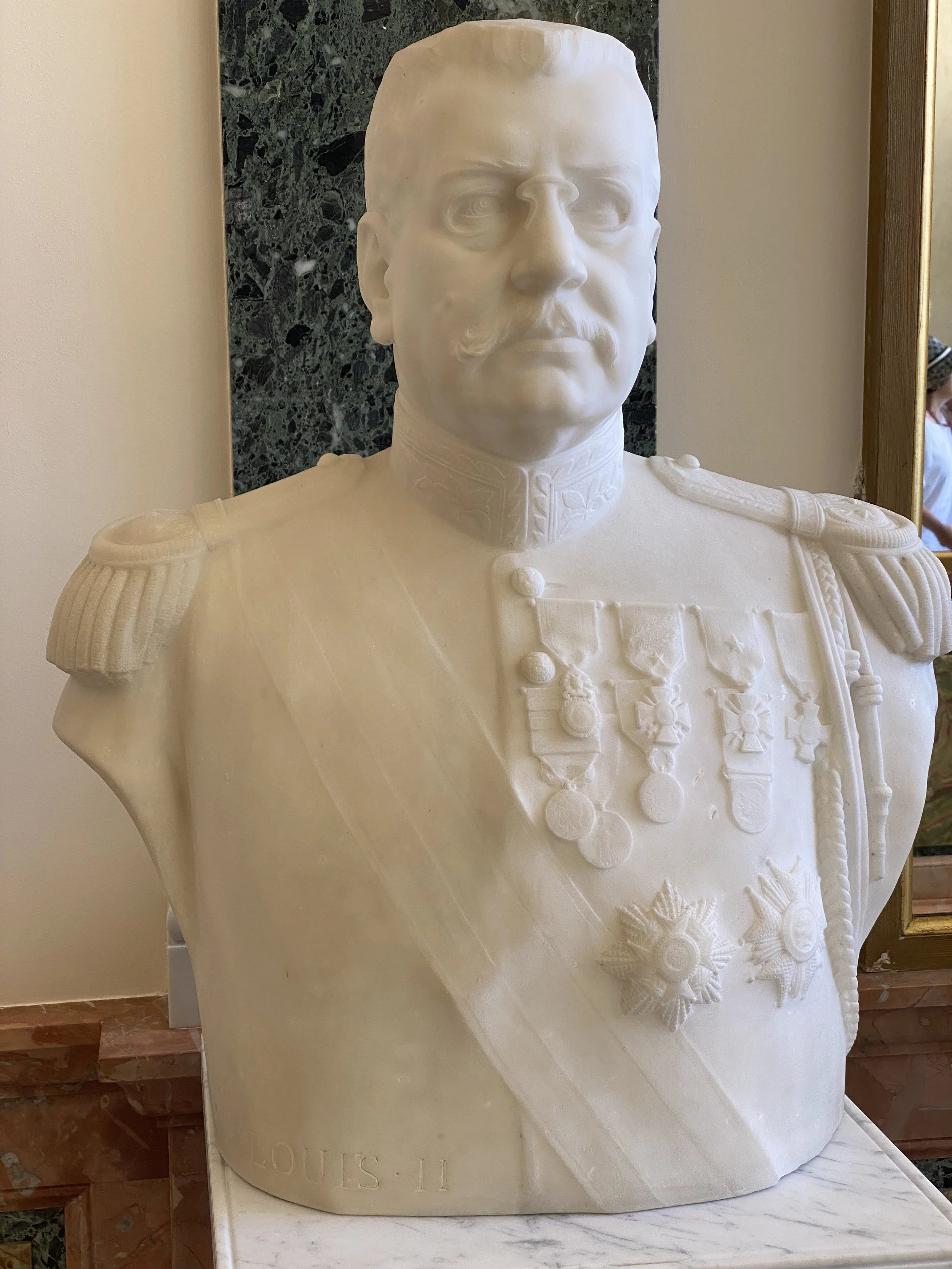 Le Prince Louis II, par Louis Maubert (1934), auteur également du buste de ce même prince, l’année suivante, sur le côté du Palais de Justice tout proche (ci-dessous). Dans la région, entre autres, il a signé le monument de la reine Victoria à Nice-Cimiez et gravé des pièces de monnaie pour le Prince Louis II.