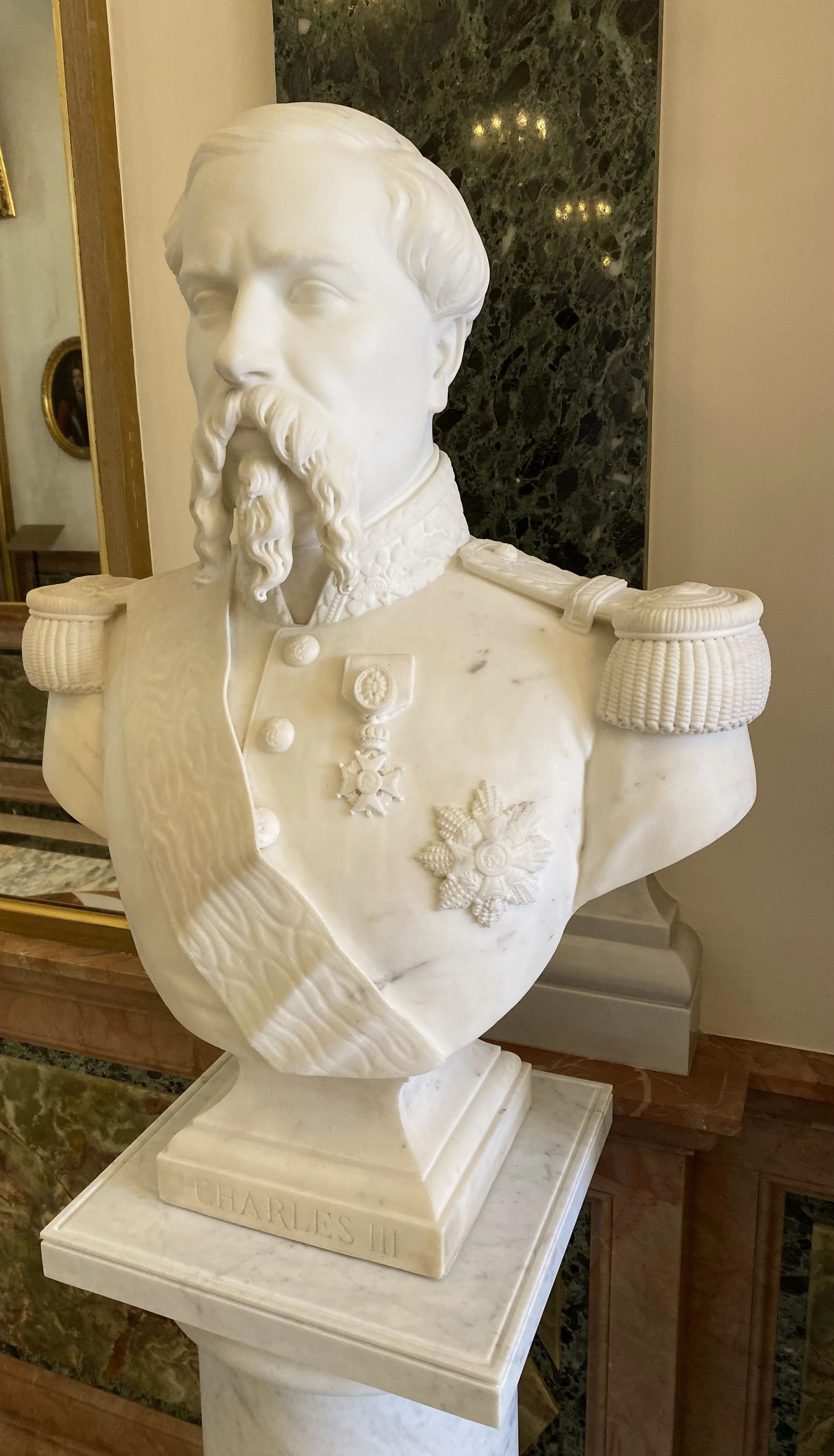 Le Prince Charles III, fondateur de Monte-Carlo, par le sculpteur parisien Mathieu Roland Meusnier (1863). Commentaire d’un Monégasque : “Mais, je l’ai déjà vu quelque part, ce buste !”. Oui, ce sculpteur a également signé, quatre ans plus tard, le buste du même prince, en haut des jardins des Boulingrins à Monte-Carlo.
