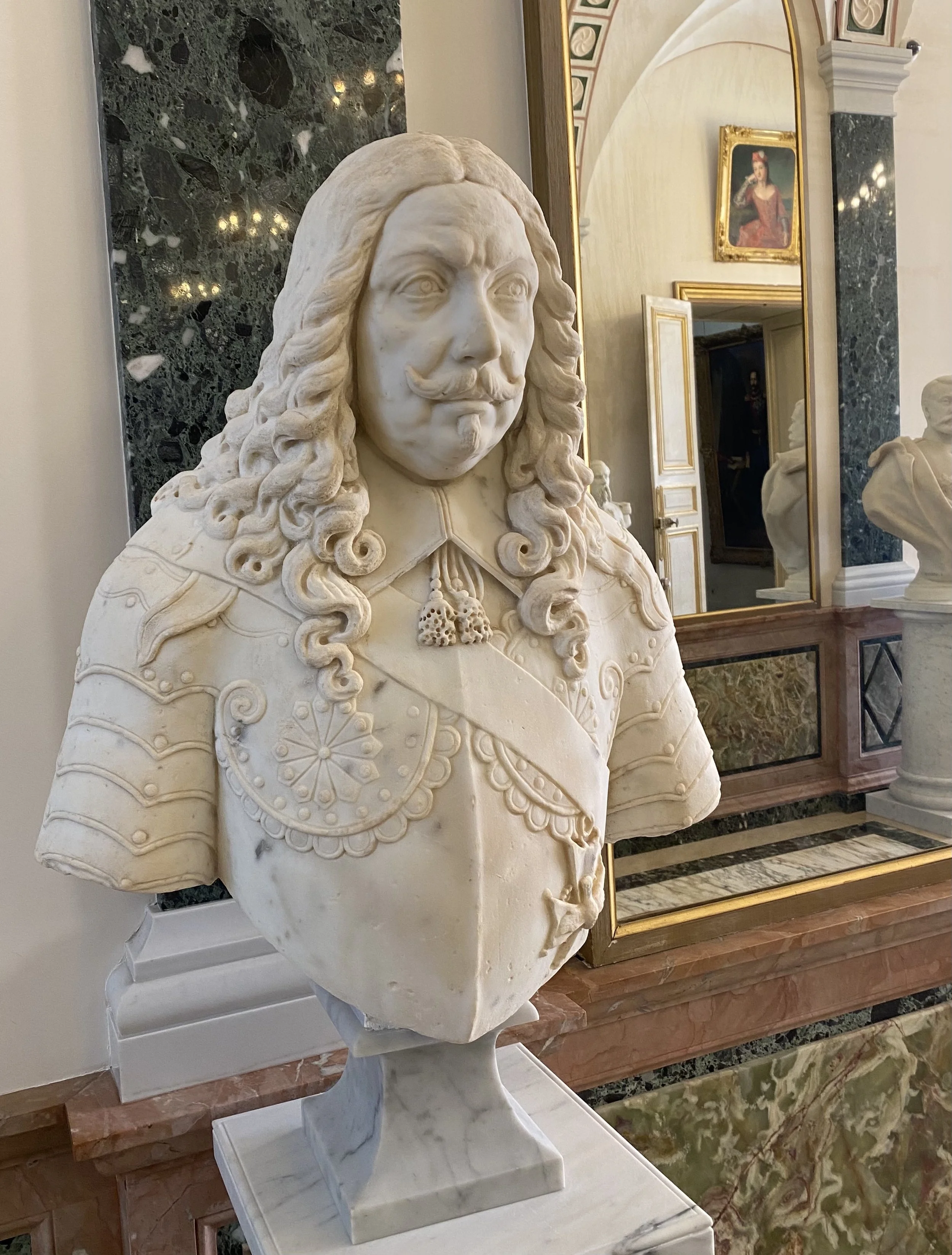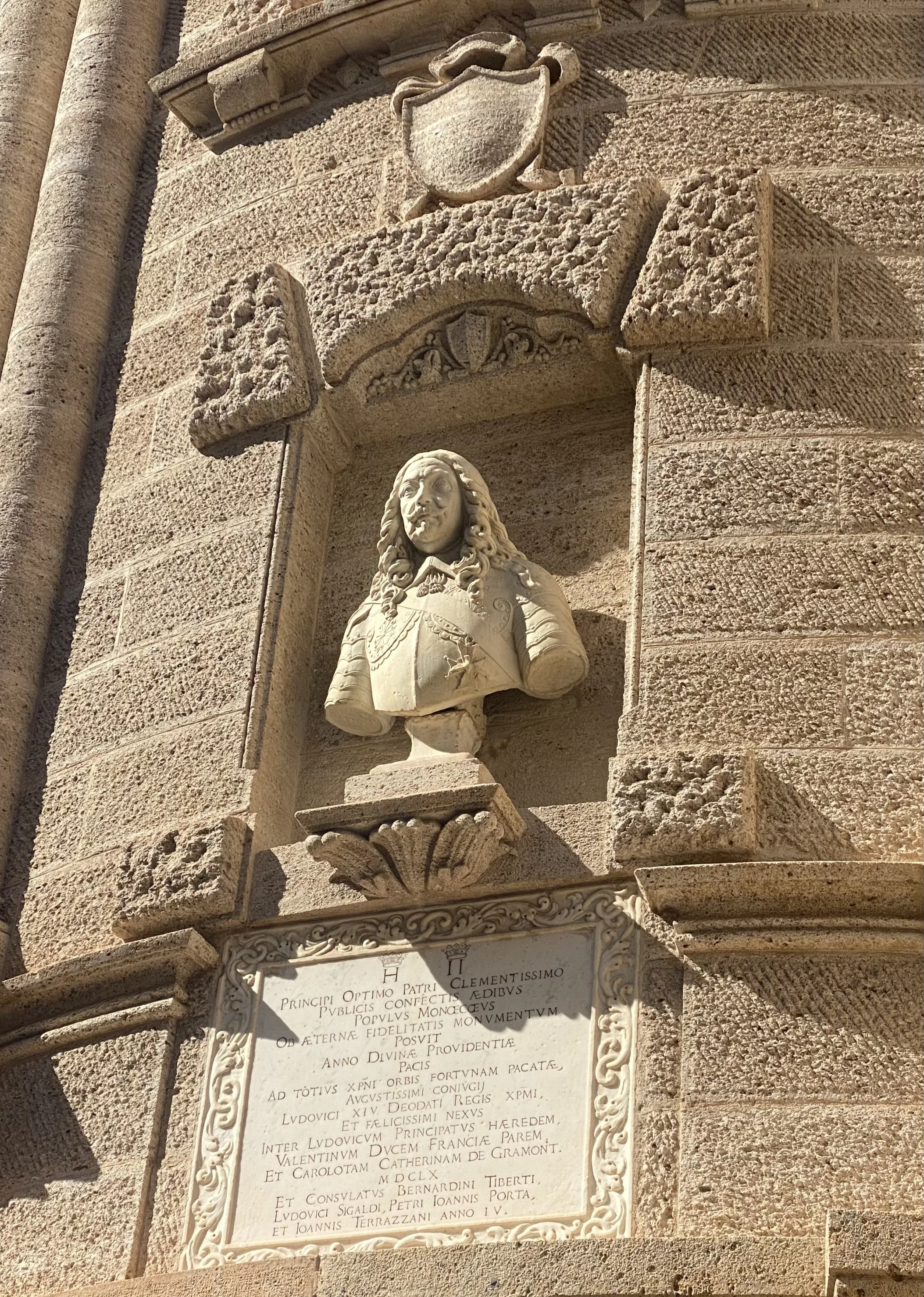 Le Prince Honoré II, premier Prince de Monaco, par le Génois Lazare Ratto (1660), qui est également l’auteur du buste de ce même prince, visible dans une niche sur le côté du Palais de Justice tout proche, ci-dessous :