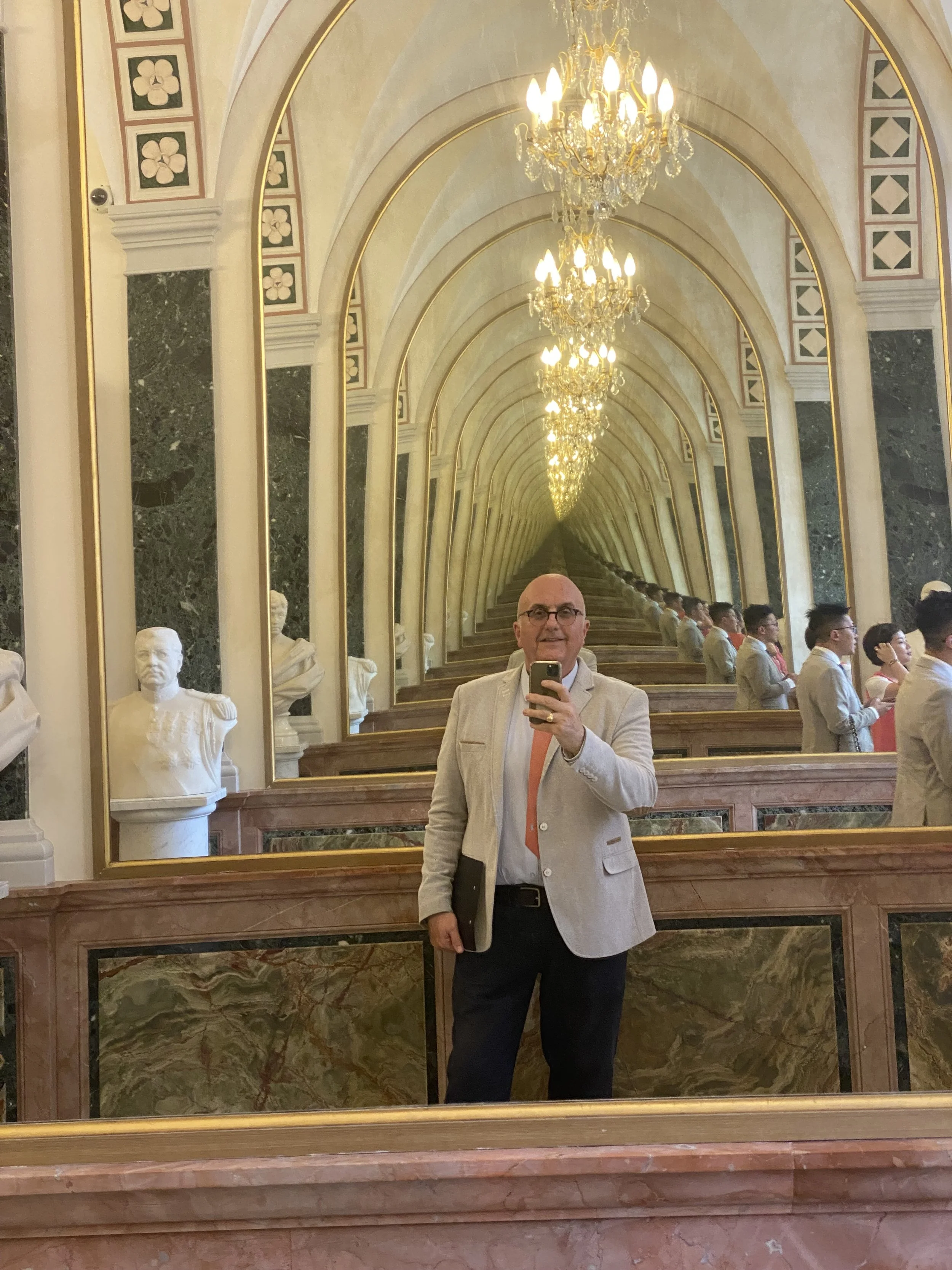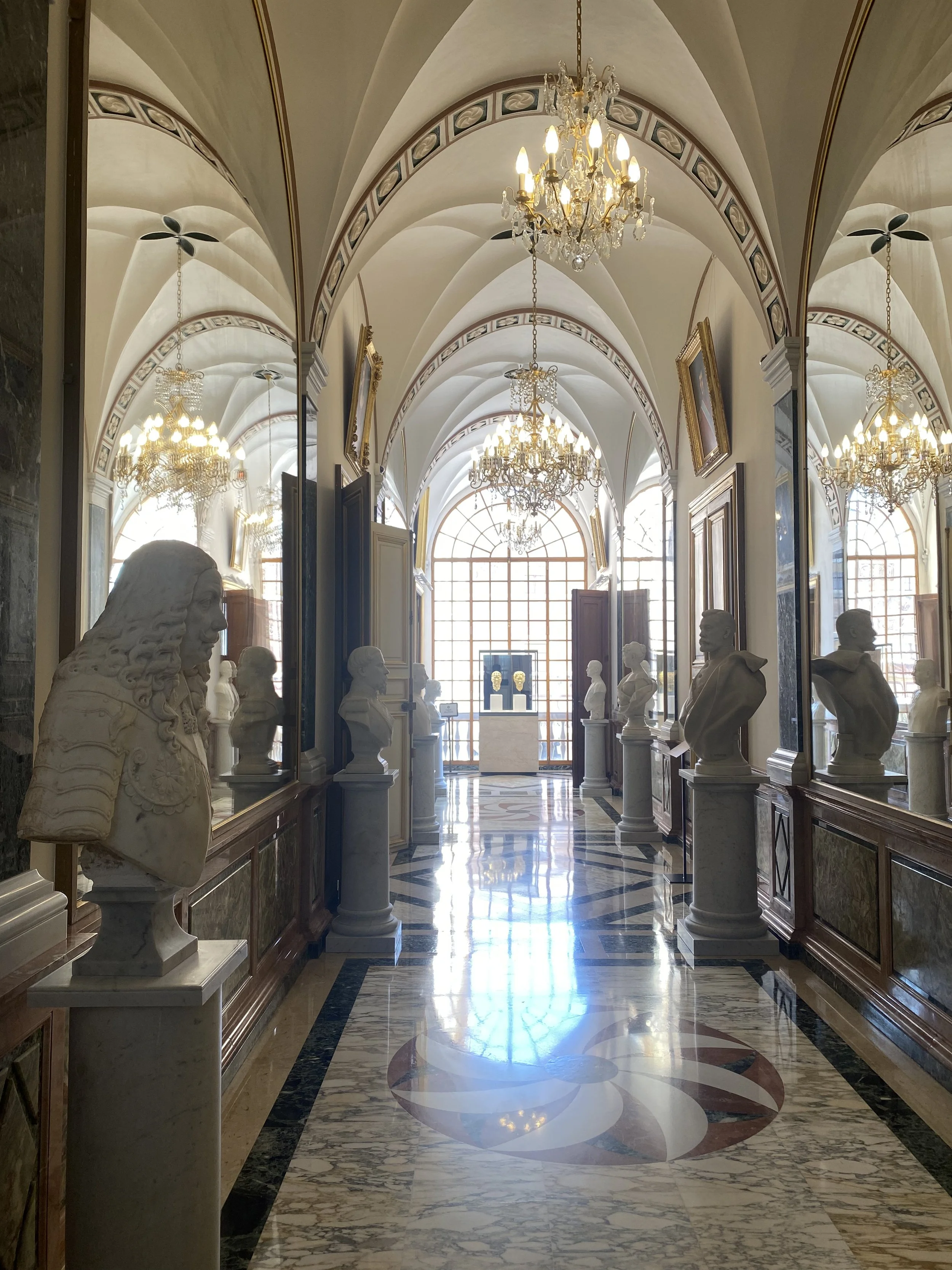 La Galerie des Princes, brillante à plus d’un titre, relie les Grands Appartements à la Galerie d’Hercule et à la Cour d’Honneur. Ses miroirs se font face et agrandissent la perspective à l’infini.