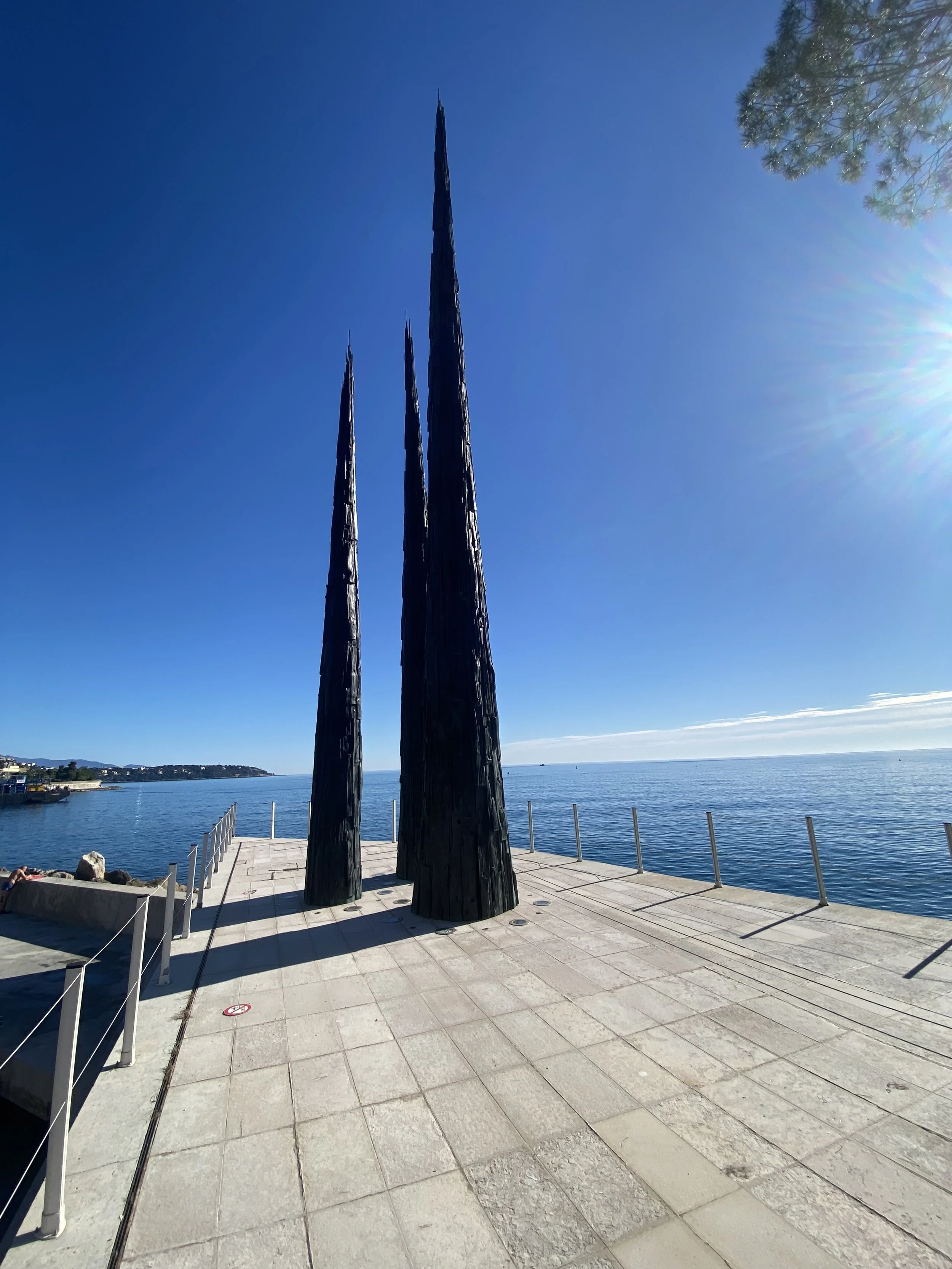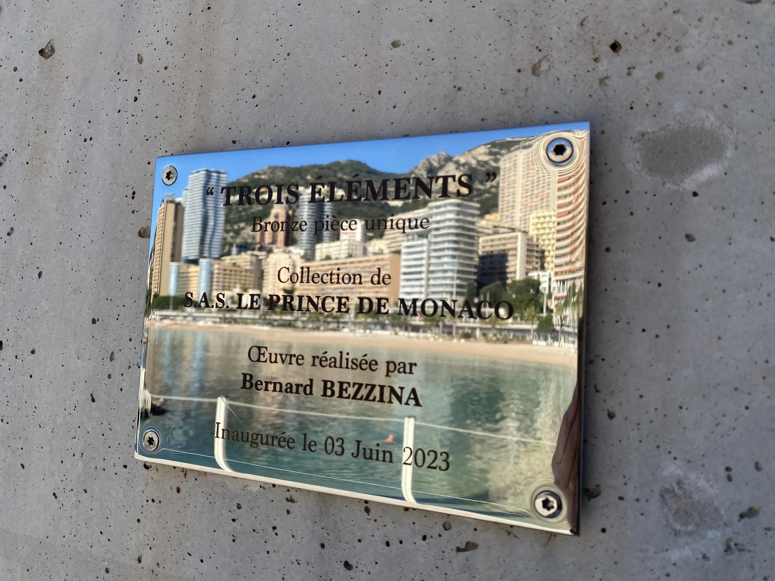 Sur la plage du Larvotto, au début du nouveau quartier de Mareterra, 3 grands cyprès de métal s’élancent vers le ciel face à la Méditerranée : cette sculpture en bronze, qui s’intitule Trois éléments, est l’œuvre de Bernard Bezzina (2023), et fait partie de la collection du Palais Princier. Le Prince Albert II a suivi la conception et la réalisation de ce projet pendant trois ans. Ces trois colonnes (10, 12 et 15 m de hauteur), font penser à du bois calciné, et évoquent à la fois la fragilité et la force, deux thèmes chers à ce sculpteur et peintre français, né en 1956, dont l’atelier se trouve près de Toulon.
