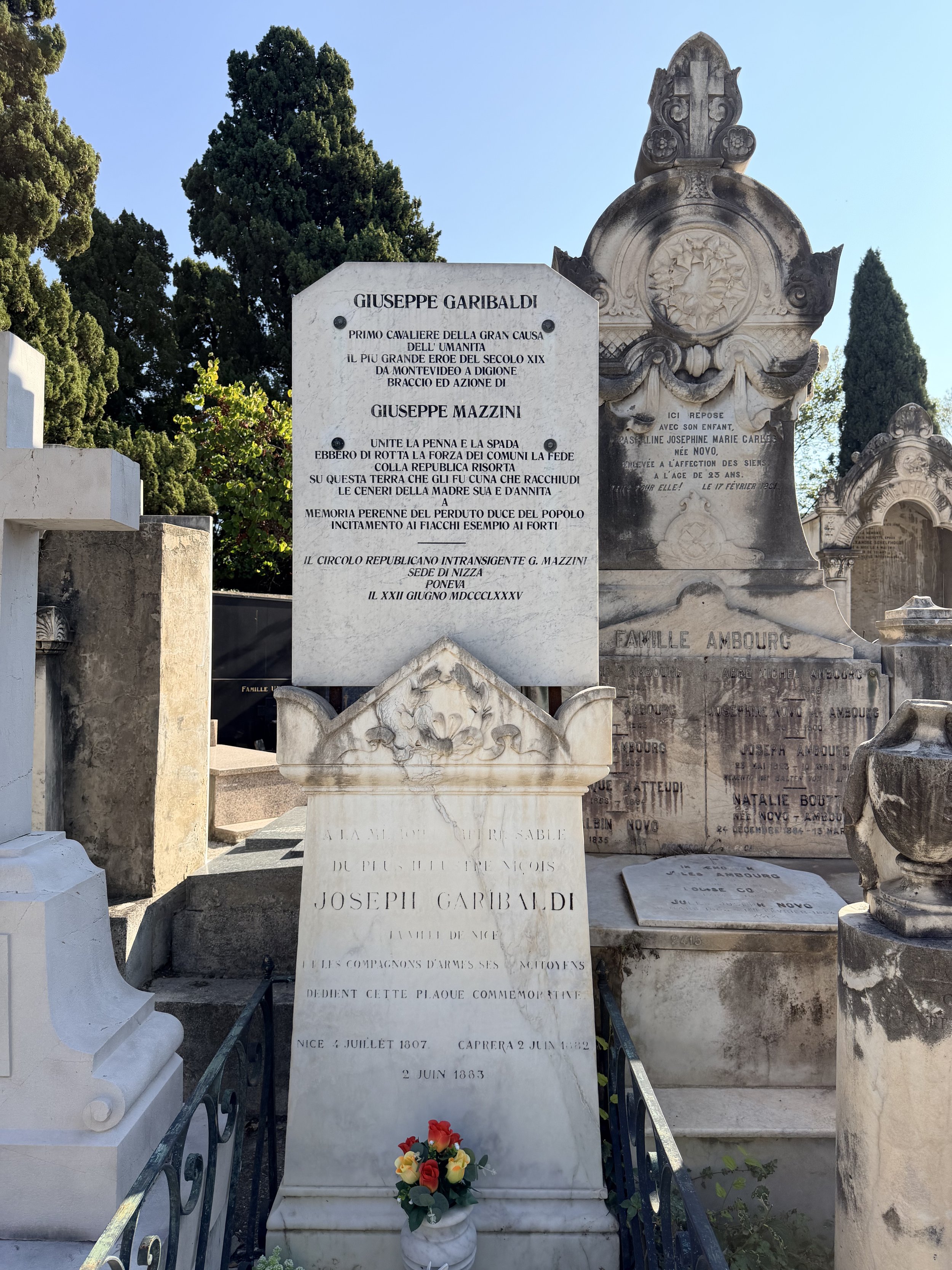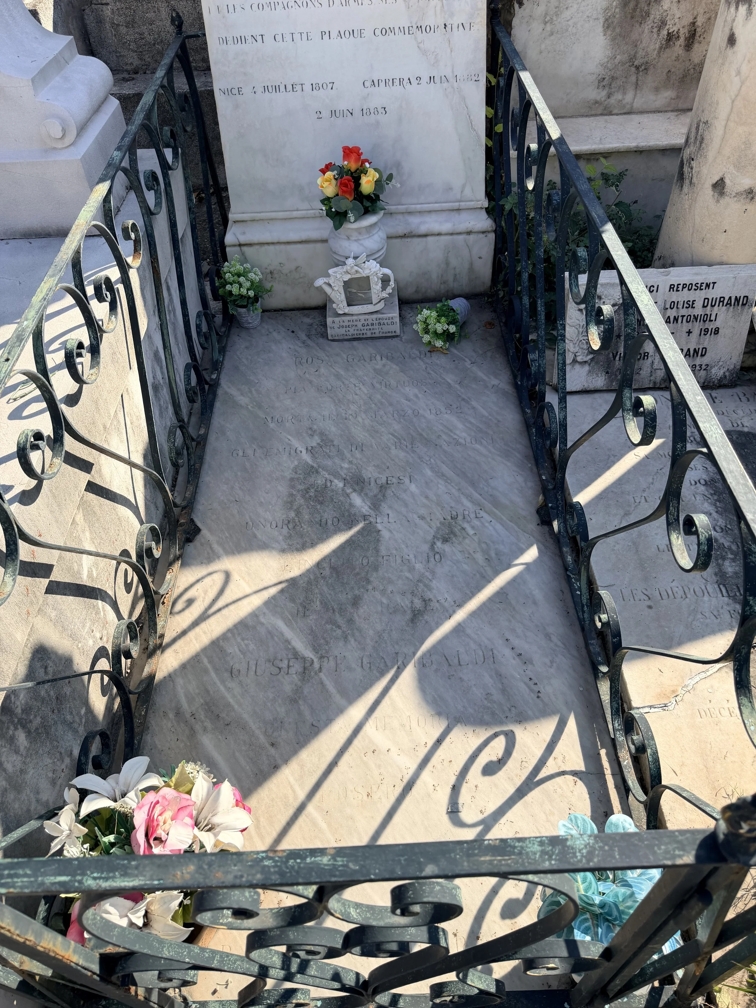 Un peu plus loin, la tombe de Rosa Garibaldi, décédée en 1852, mère de Giuseppe Garibaldi, contient la sépulture d’autres membres de cette famille. Le célèbre Niçois, qui a participé à l’unité italienne, est inhumé, quant à lui, à Caprera, petite île au nord de la Sardaigne. Au-dessus de la tombe, deux stèles (1883 et 1885) en italien et en français lui rendent hommage.