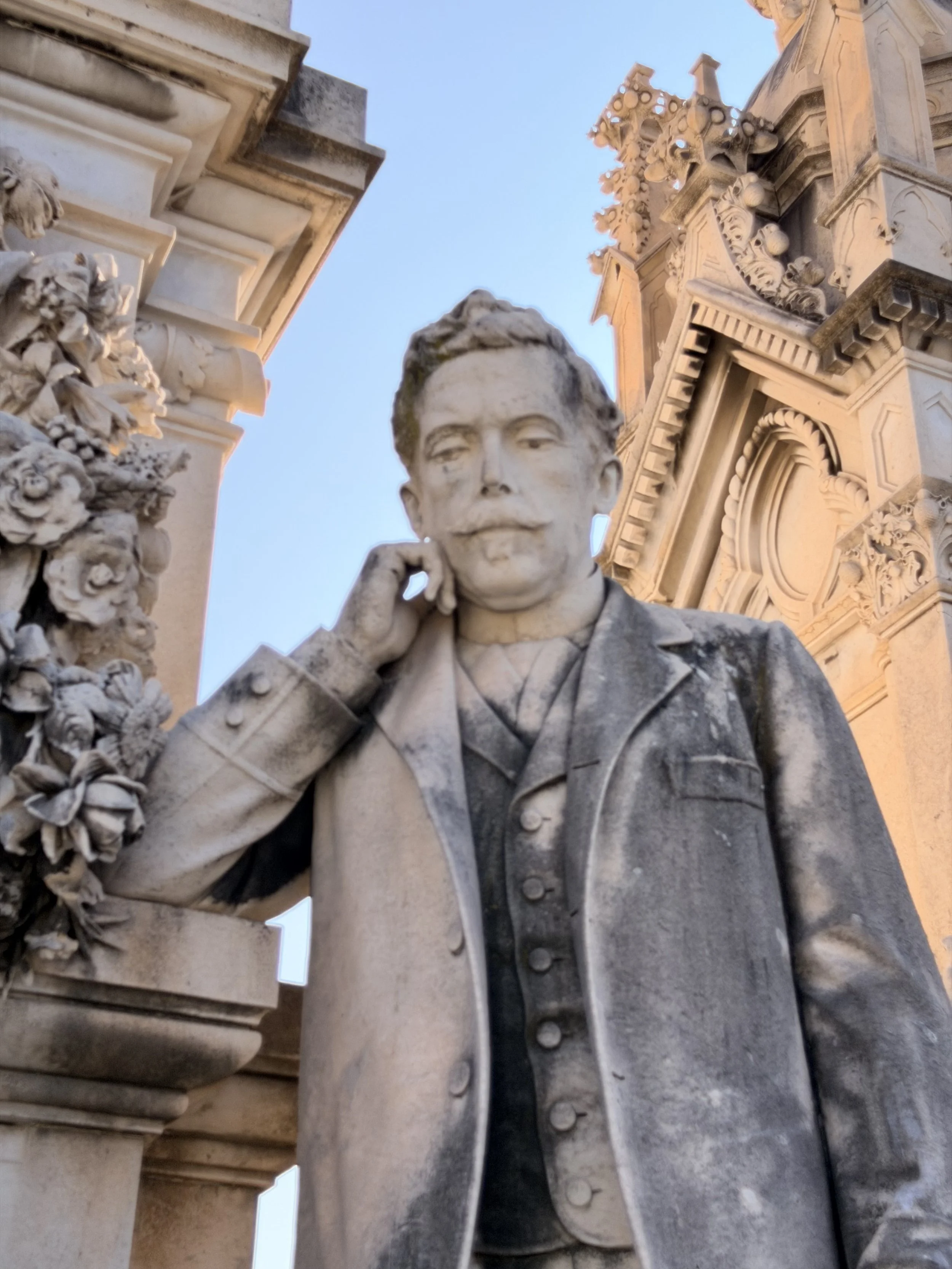 Ci-dessus, la tombe de Gaston Leroux au cimetière du château de Nice. Il est représenté sur sa tombe, lisant à un enfant.