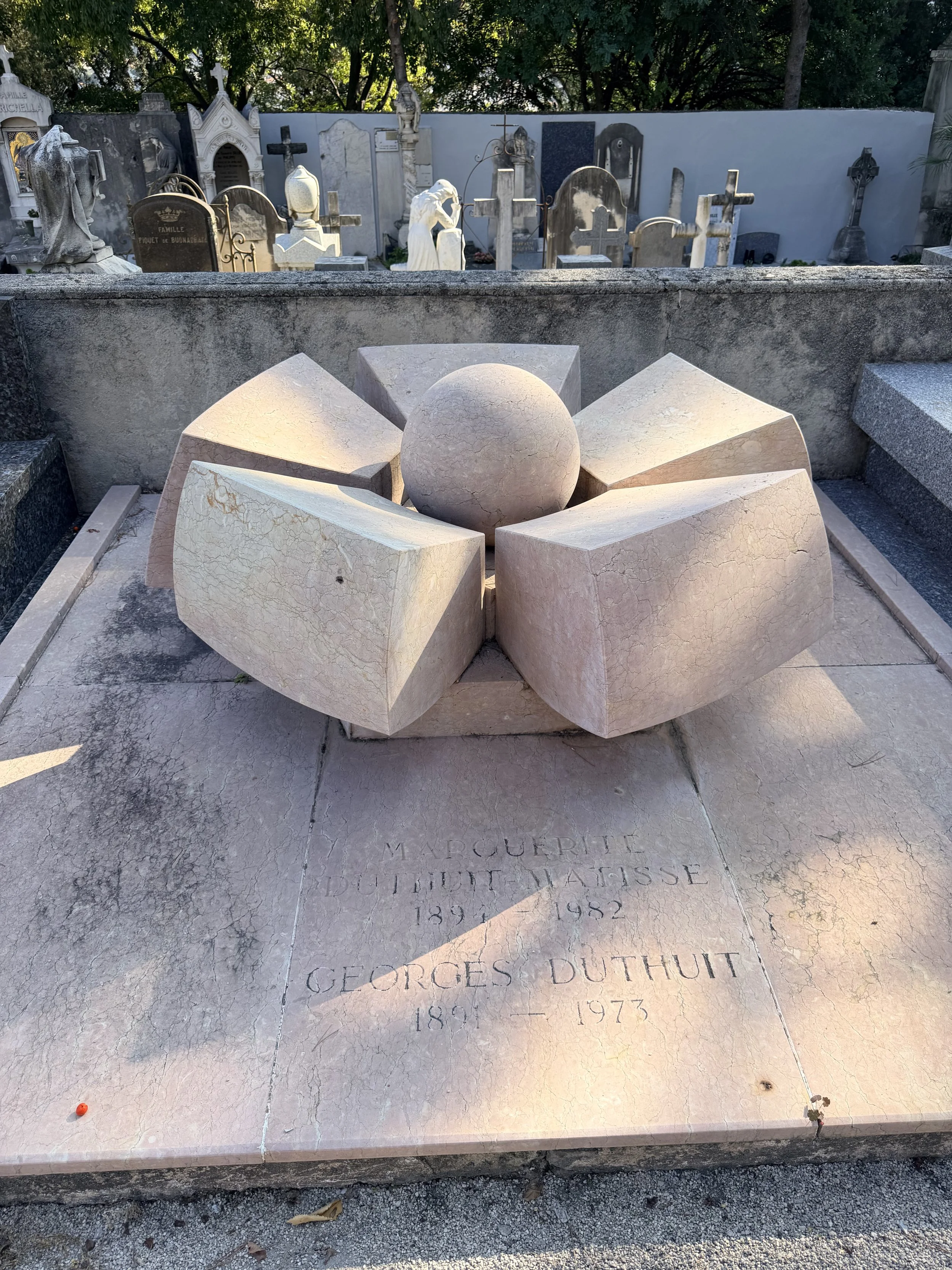 On ne peut pas manquer cette marguerite sculptée sur la tombe de Marguerite Duthuit-Matisse. Cette peintre et résistante était née Marguerite Matisse, fille aînée d’Henri Matisse et de Caroline Joblaud, l’une des modèles de Matisse. Le grand maître du Fauvisme l’avait reconnue en 1897, raison pour laquelle elle portait son nom, et elle posa pour de nombreux portraits. Elle fut la demi-sœur de Jean et Pierre Matisse, et épousa l’écrivain Georges Duthuit, qui repose auprès d’elle. Elle contribua grandement à la création du Musée Matisse de Nice.