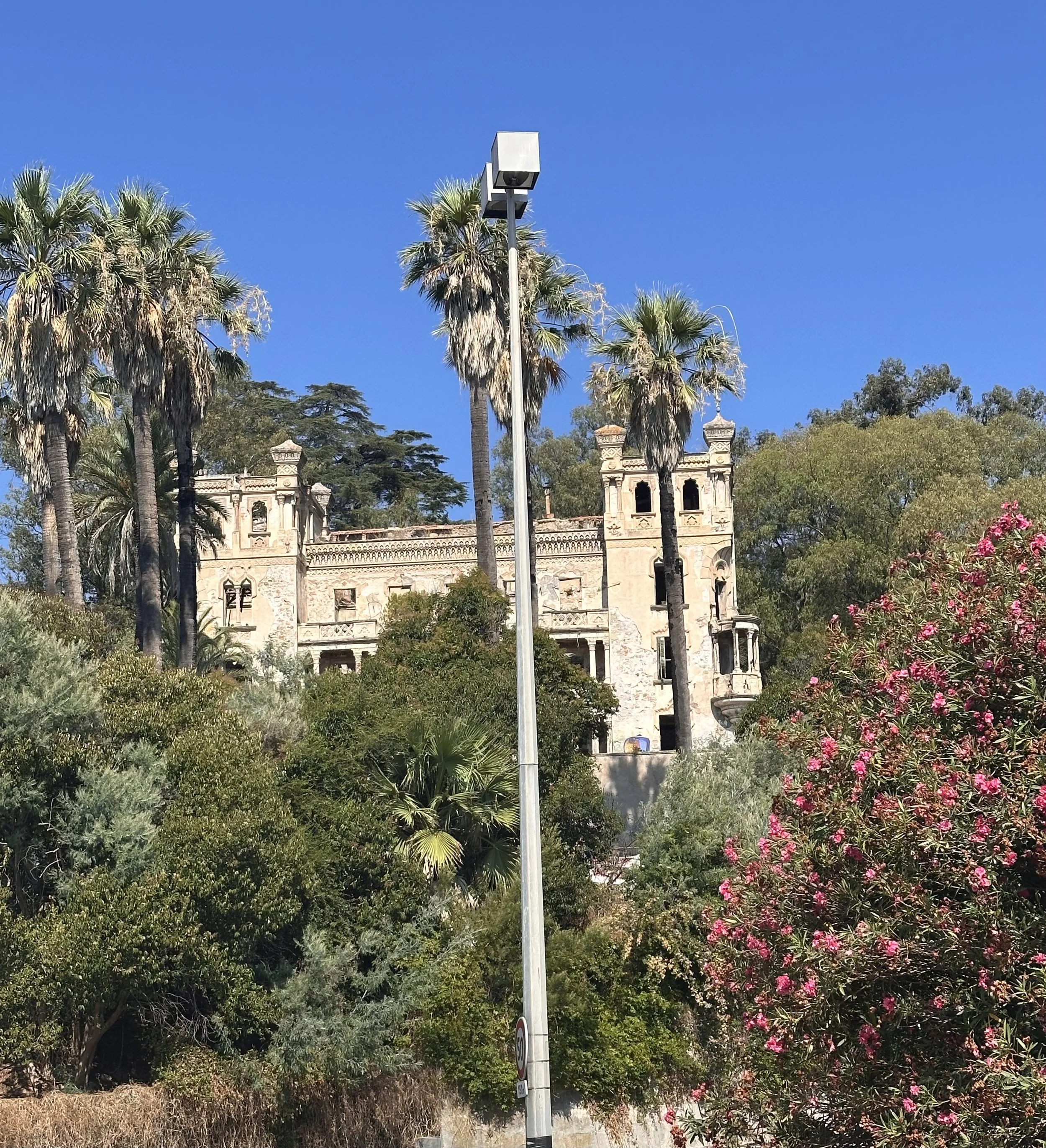 Ci-dessus, les ruines du Château Robert à Golfe-Juan, dont Emil Jellinek fut un temps copropriétaire. Ce château avait été construit au milieu du 19ème siècle, dans un style de manoir anglais. On n’en connaît pas le commanditaire avec exactitude. Vers 1875, le maire de Vallauris, André- Ferdinand Dervieu, ancien consul de France à Hambourg, lui donna son allure de palais mauresque, et en fit un hôtel, l’Hôtel d’Orient, surnommé château Robert, prénom du père d’André Ferdinand. La propriété fut rachetée en 1904 par Emil Jellineck et Charles Lehmann, lequel vendit ses parts l’année suivante au baron belge Pierre de Caters. en 1914, Jellineck fut dépossédé de ses biens en France par le Gouvernement en guerre et de Caters en resta l’unique propriétaire. Aujourd’hui, c’est la Ville de Vallauris qui en est propriétaire, et le bâtiment tombe en ruine. La précédente municipalité a vendu le terrain attenant au Conservatoire du Littoral (Parc du Paradou), ce qui compromet les projets, vu l’étroitesse du terrain restant sur lequel est construit le château. Photo Gilles Rycine.