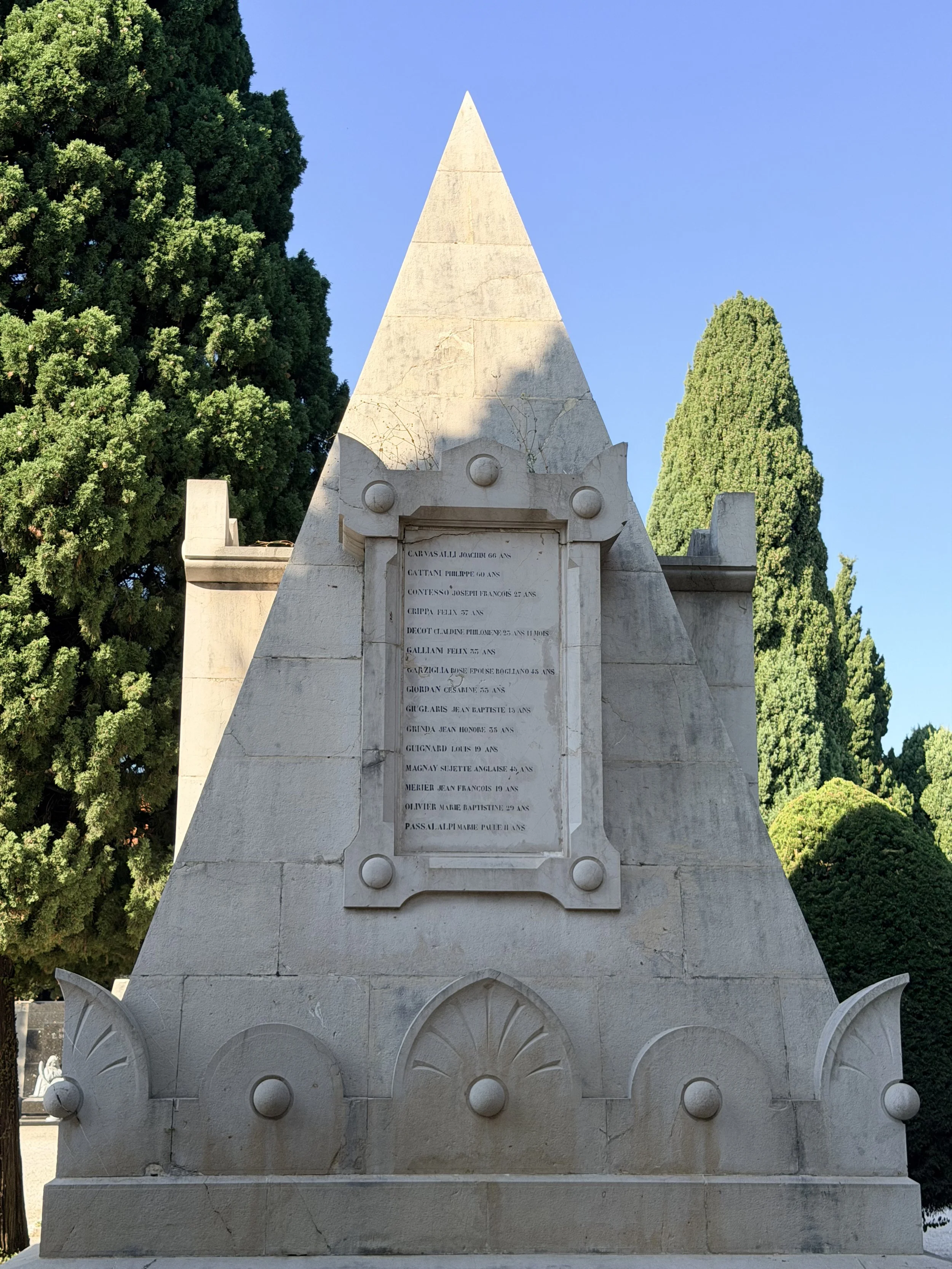 À l’entrée du cimetière, une étrange pyramide a été érigée à la mémoire des deux cents personnes décédées dans l’incendie de l’Opéra de Nice en 1881, juste en face de la tombe d’un romancier français, pour lequel on a déplacé le robinet d’eau à afin de lui réserver une place d’honneur à l’entrée du cimetière …