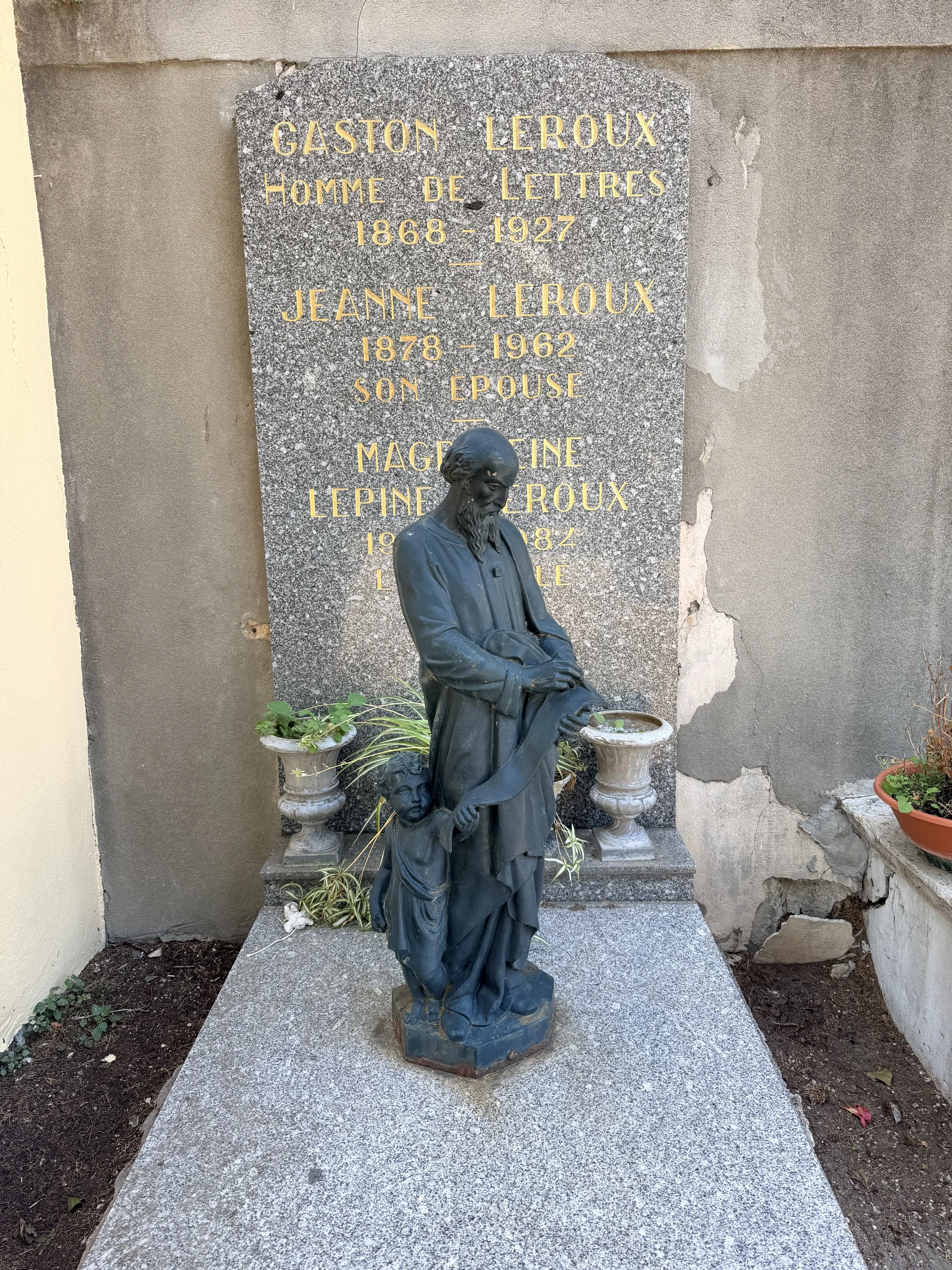 Gaston Leroux a été enterré ici à sa mort en 1927. Il fit de longs séjours sur la Côte d’Azur, surtout à Nice, où il résidait dans le Palais Étoile du Nord, un superbe immeuble construit par l’architecte Charles Dalmas (auteur du Palais de la Méditerranée et de l’hôtel Carlton), 53, Boulevard Gambetta, où il écrivit la plupart de ses œuvres. L’écrivain perdit beaucoup d’argent au Casino de Monte-Carlo, et laissa des dettes de jeu à sa veuve.