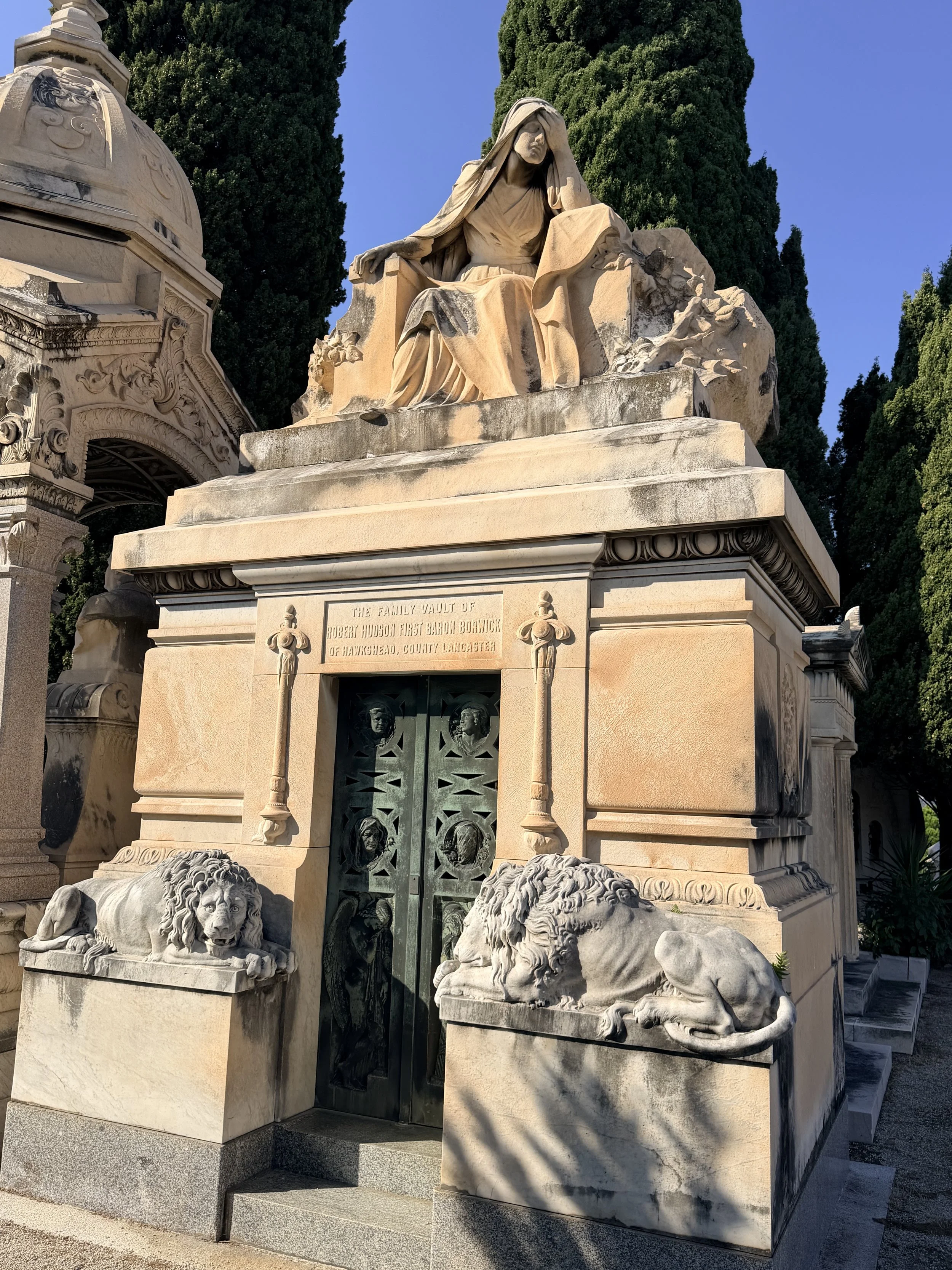 On y trouve parfois des tombeaux étonnants, comme ci-dessus celui d’un baron anglais, décédé en 1936, dont le nom et le titre figurent au-dessus de la porte. Ce juge de paix de Londres résidait souvent à Nice.
