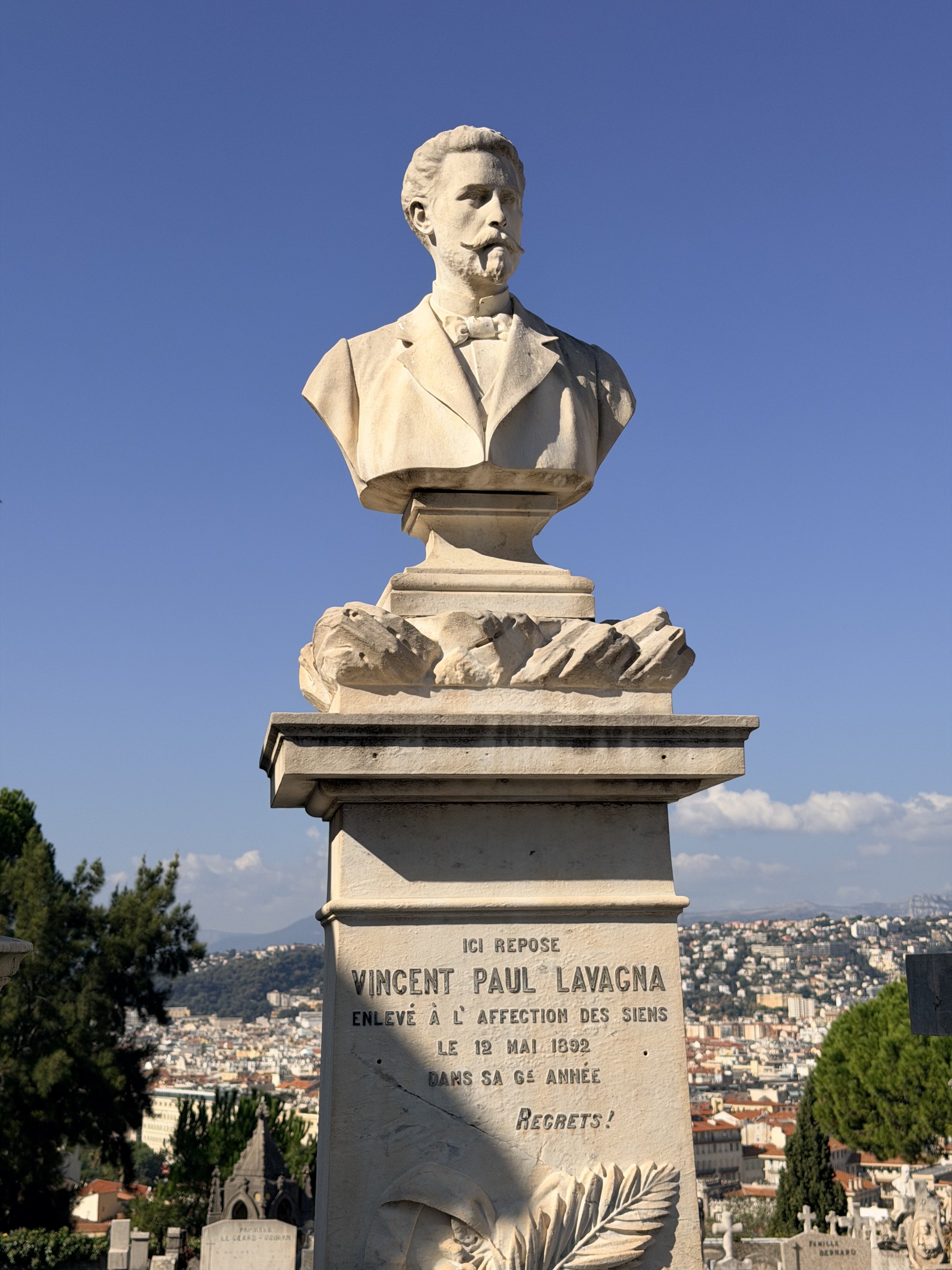 La statue en bronze (vers 1875) d’Alexandre Ivanovitch Herzen domine une partie des tombes du cimetière, là où il voulut être enterré. On dirait un personnage d’un roman russe. Né à Moscou en 1812, son patronyme (Herz, cœur en allemand) a été inventé par son père à la naissance. Il est mort à Paris en 1870, mais repose à Nice. Après une éducation aristocratique, en russe, en allemand et en français, il est devenu écrivain, philosophe, journaliste et critique littéraire. Exilé en France, il a voyagé en occident et vécu à Nice à partir de 1852. Militant politique, il s’est opposé au régime tsariste, en particulier au servage, et est considéré de nos jours comme l’un des précurseurs de la Révolution du peuple russe et du socialisme.