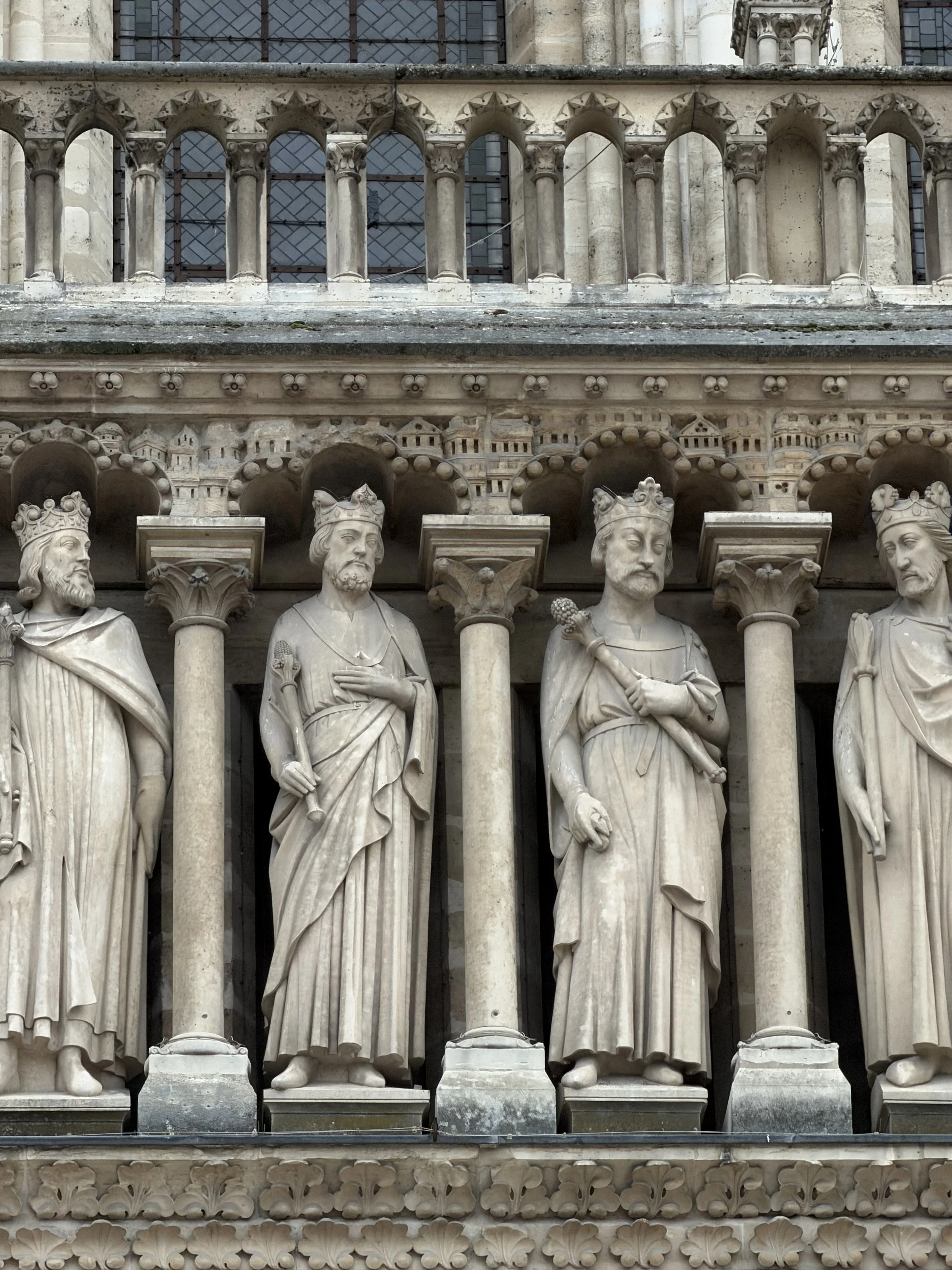 La galerie des rois, sur la façade. On la doit aussi à Viollet-Le-Duc. 28 statues des ancêtres de la Vierge, véritable généalogie de pierre. Les statues précédentes avaient été détruites à la Révolution…