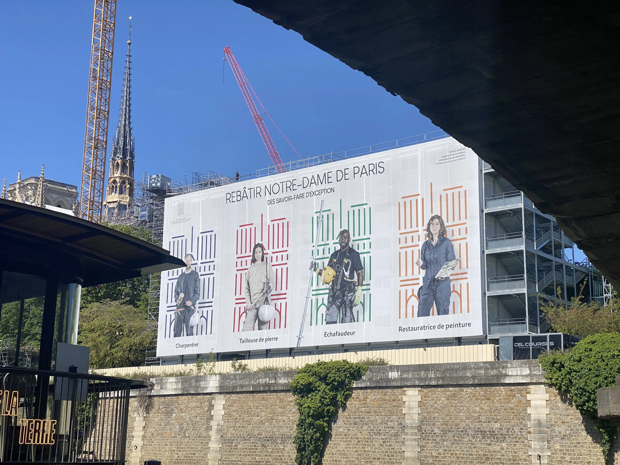 Un hommage à quelques-uns des 25 corps de métiers qui ont restauré le monument. La cathédrale est au cœur de l’île de la Cité, dans le 4ème Arrondissement.