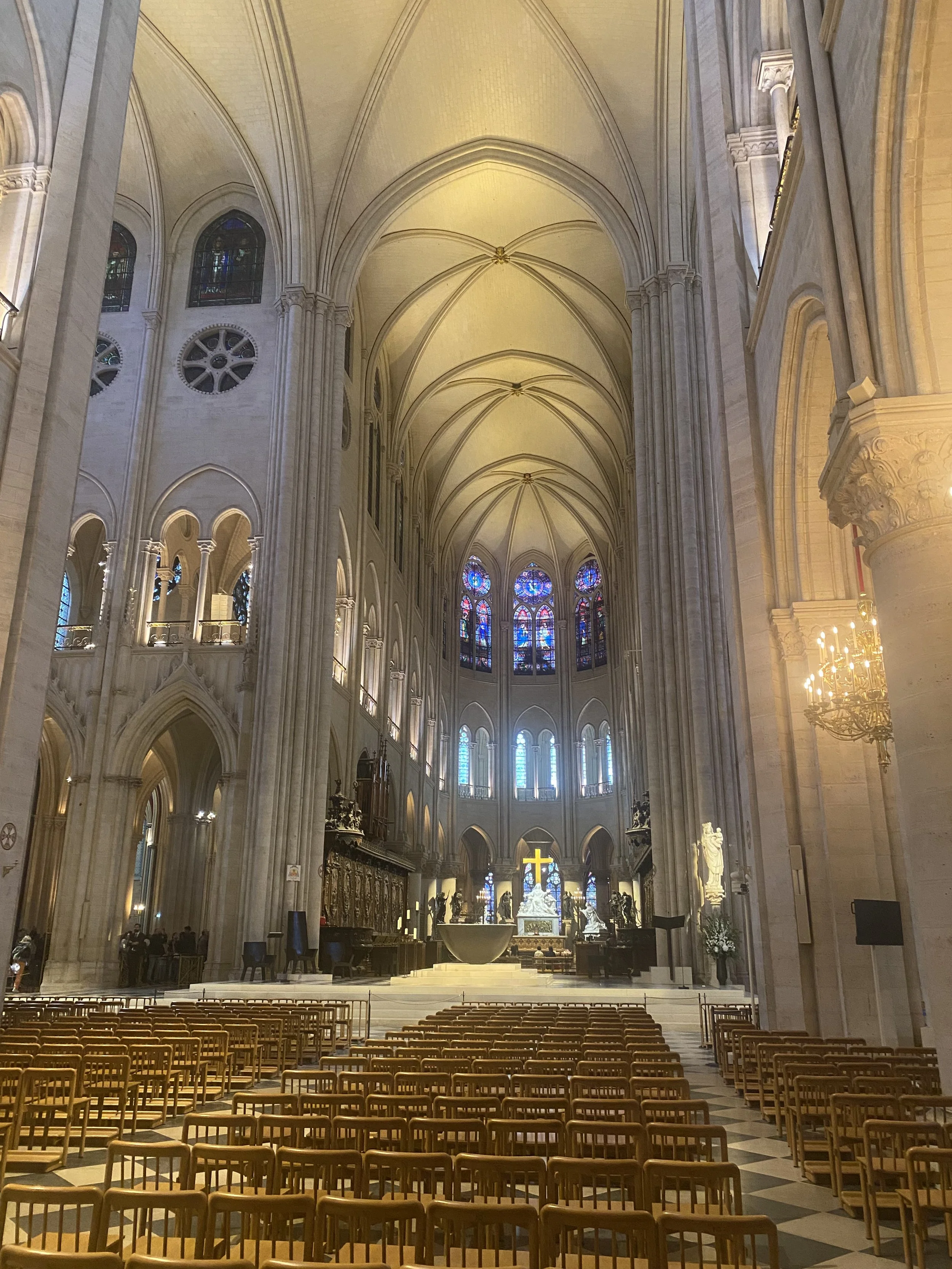 Le point de vue du guide-conférencier : Il aura fallu près de 200 ans pour construire cette cathédrale, et seulement quelques heures pour qu’elle soit ravagée par l’incendie de 2019, puis seulement 5 ans pour la restaurer. Après l’incendie, il a fallu près de 6 mois pour enlever les 40.000 pièces de l’échafaudage calciné (200 tonnes de métal), qui avait été monté pour restaurer la flèche avant l’incendie. Aujourd’hui, cette cathédrale a un éclat qu’elle n’a pas connu depuis des siècles. Le 8 décembre 2024 la réouverture a été marquée par les 3 coups portés sur la porte principale par l’évêque de Paris, symbolisant que seule la croix du Christ ouvre les portes du Ciel.