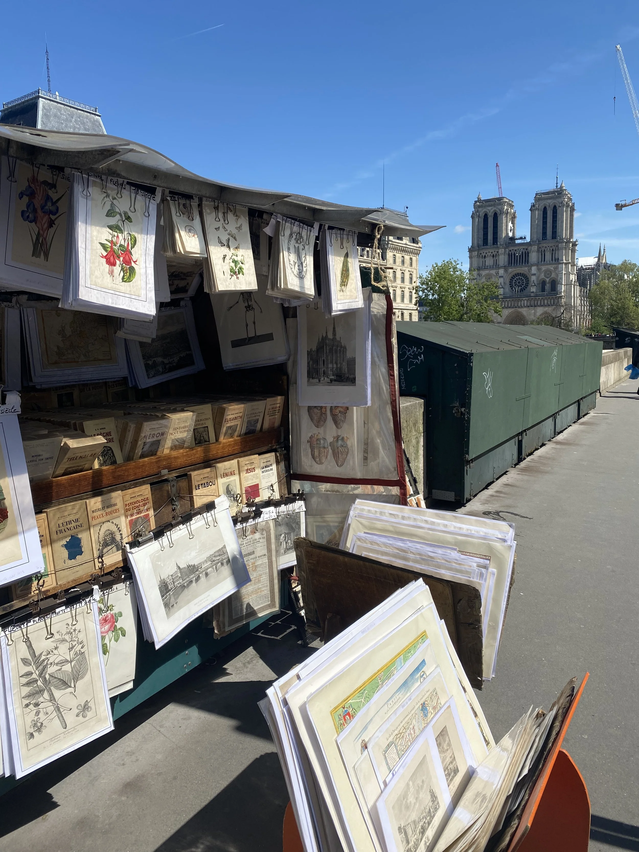 Les bouquinistes des quais de Seine nous conduisent vers Notre-Dame de Paris, alors en plein travaux…