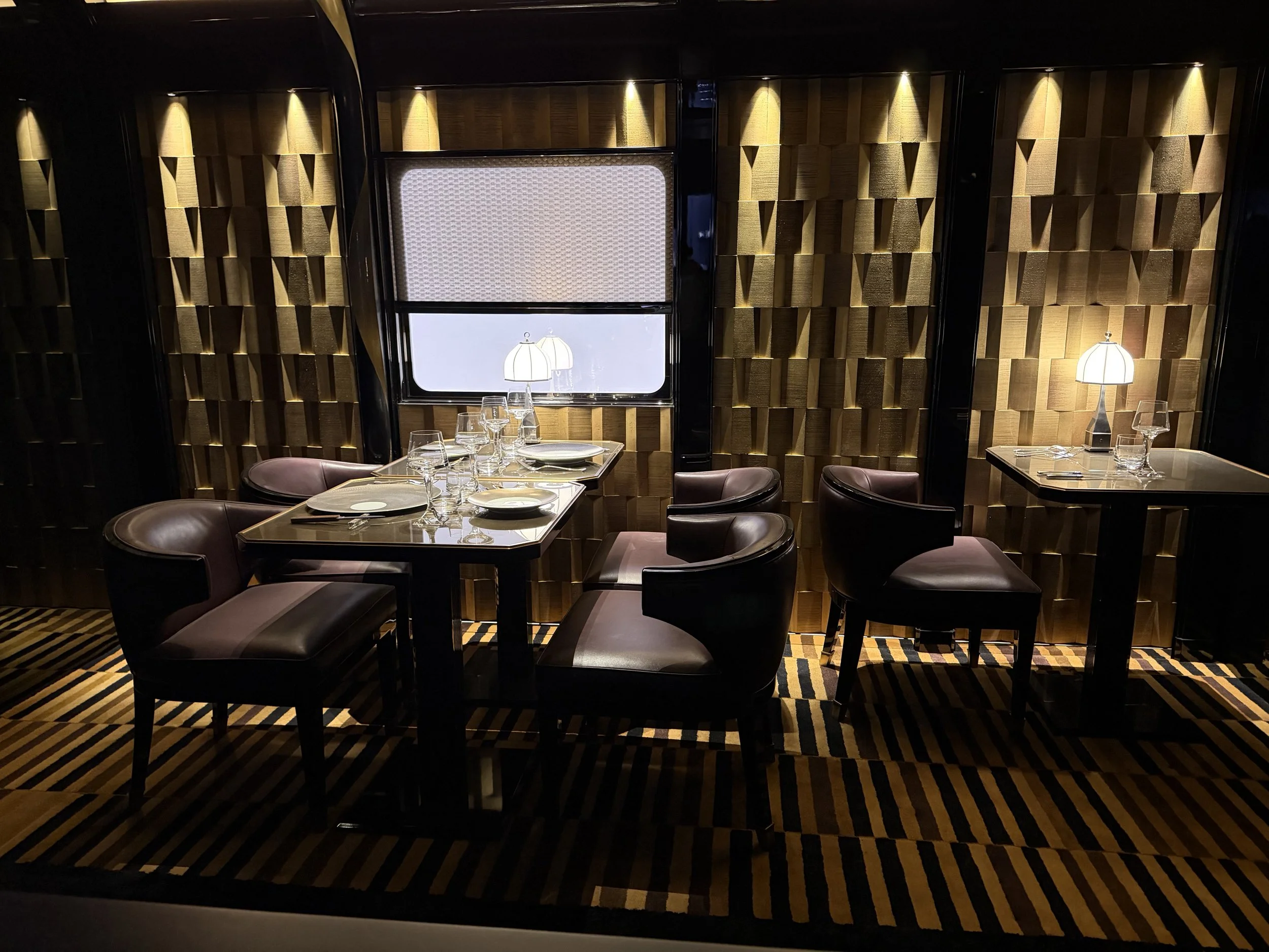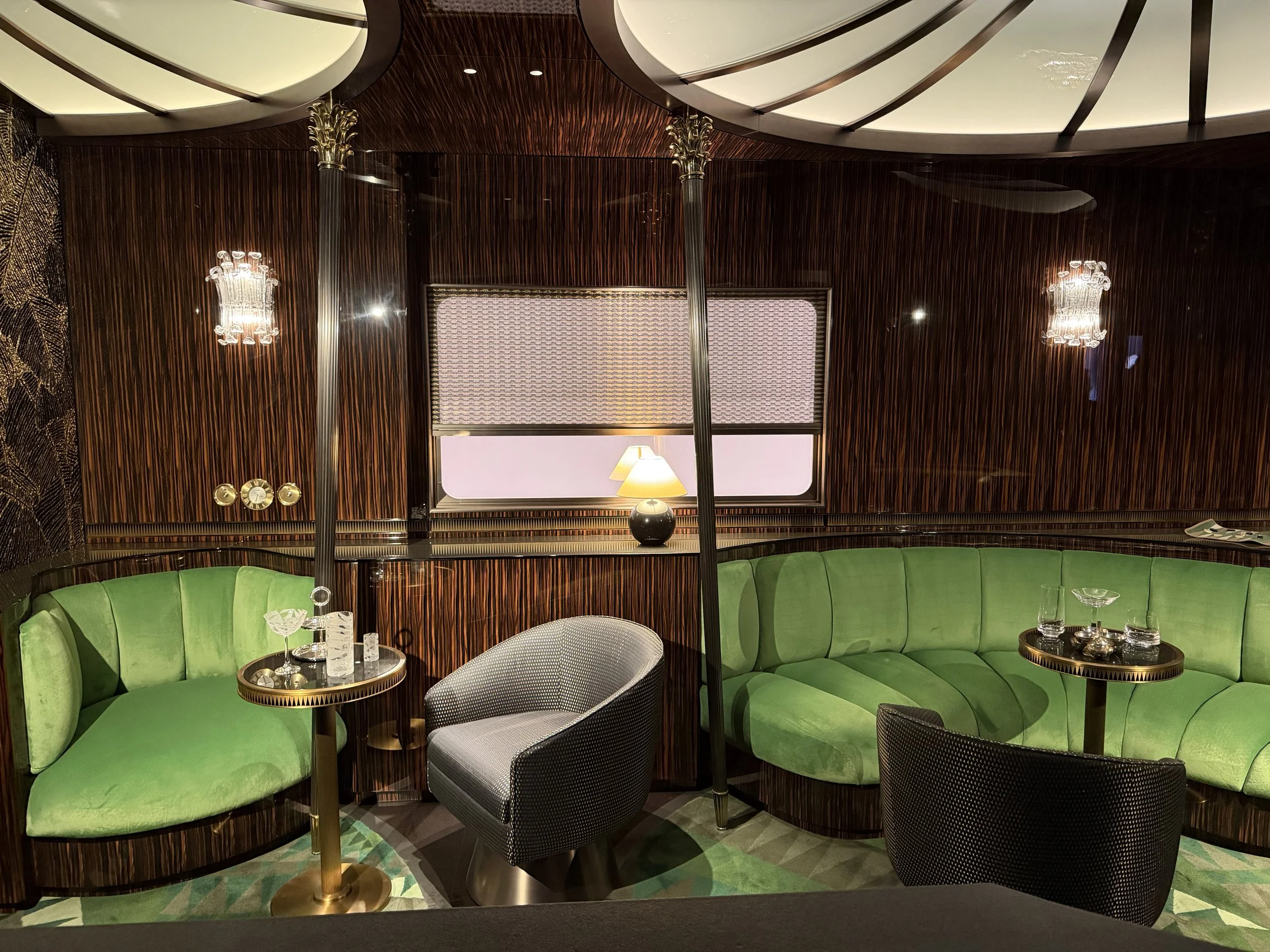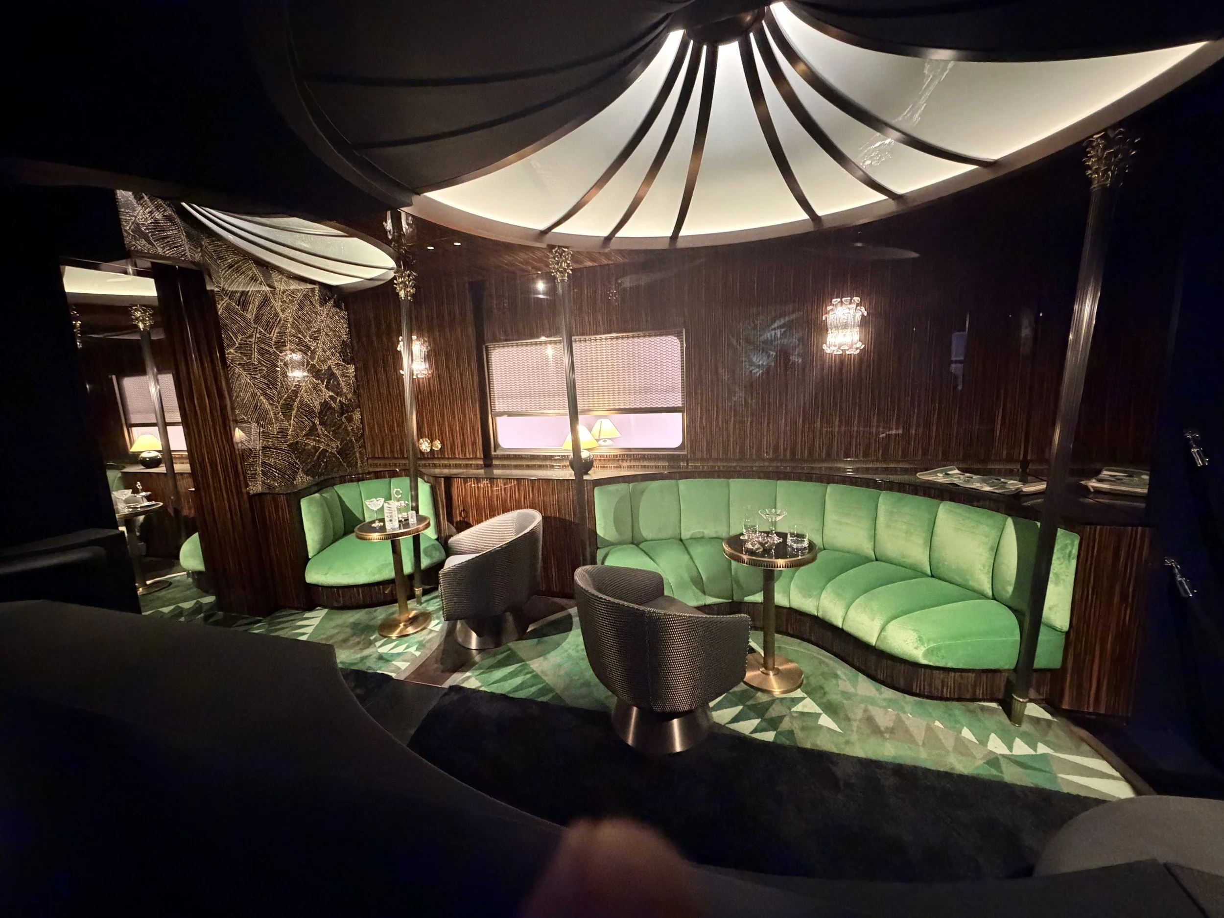 Les coupoles de lumière de la voiture-bar rappellent l’esprit du Second Empire. Du palissandre, du marbre, du verre, du bronze.