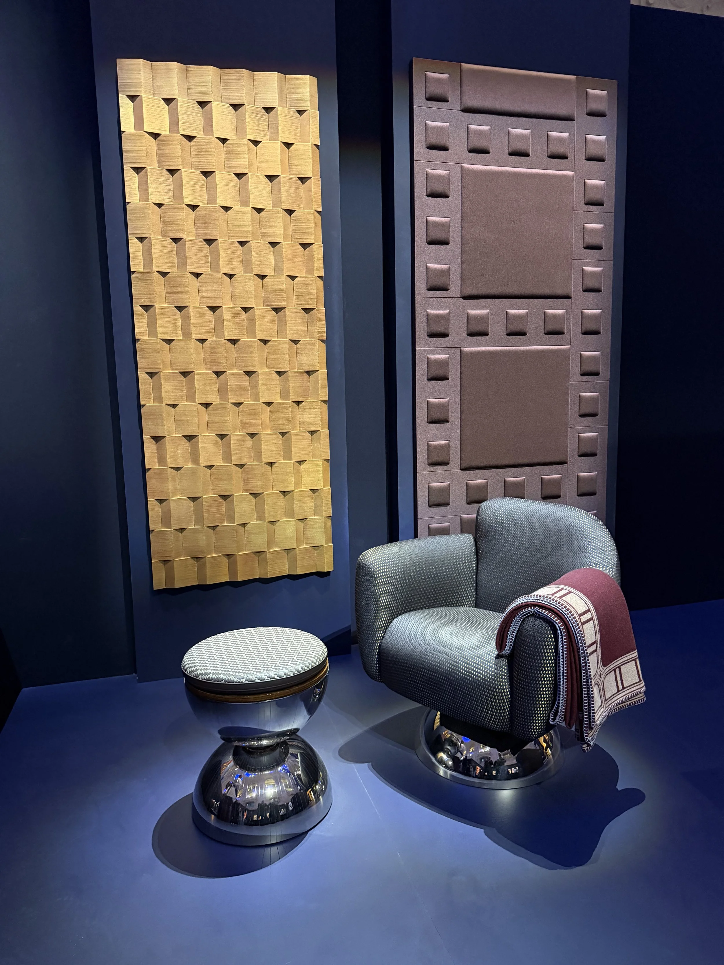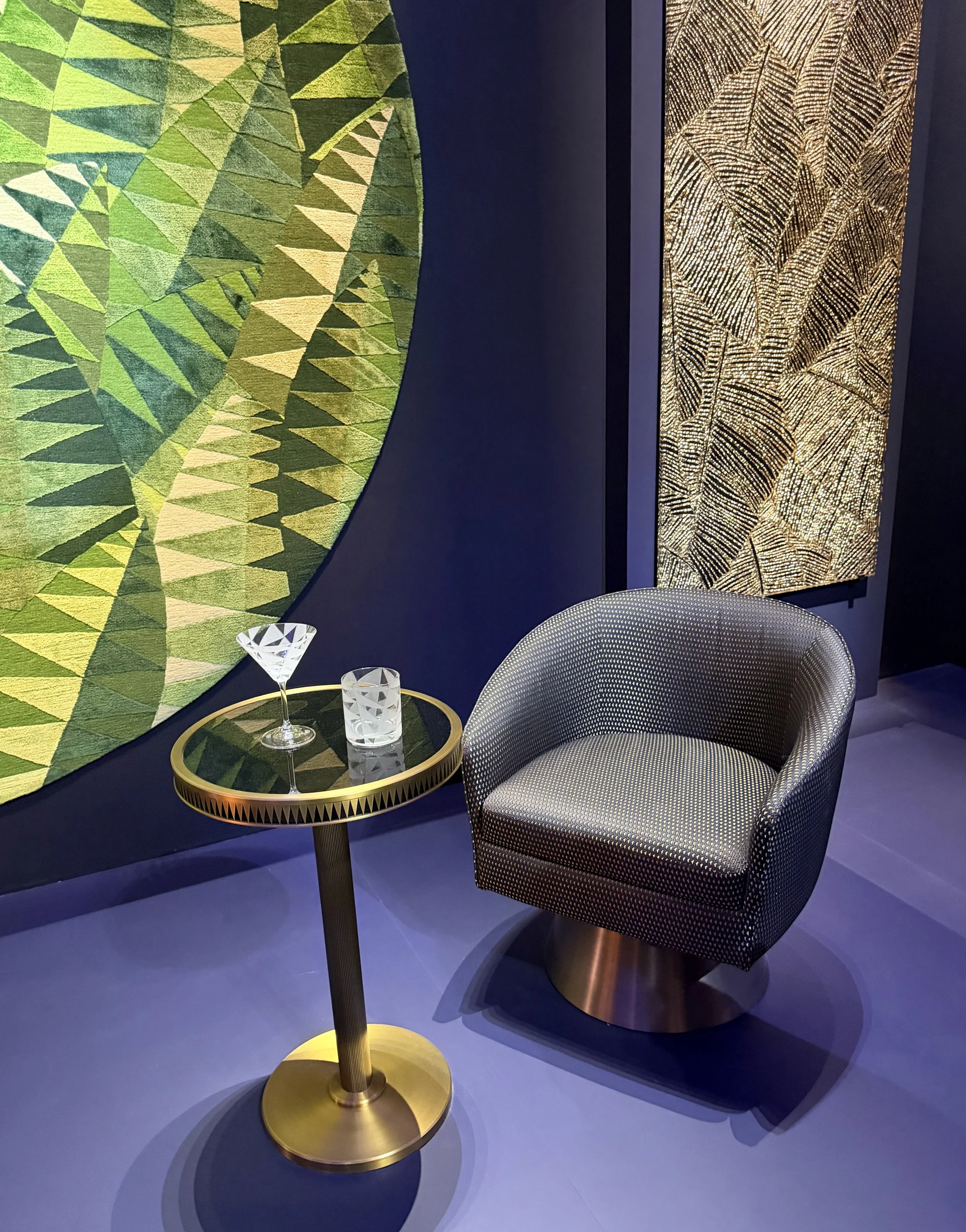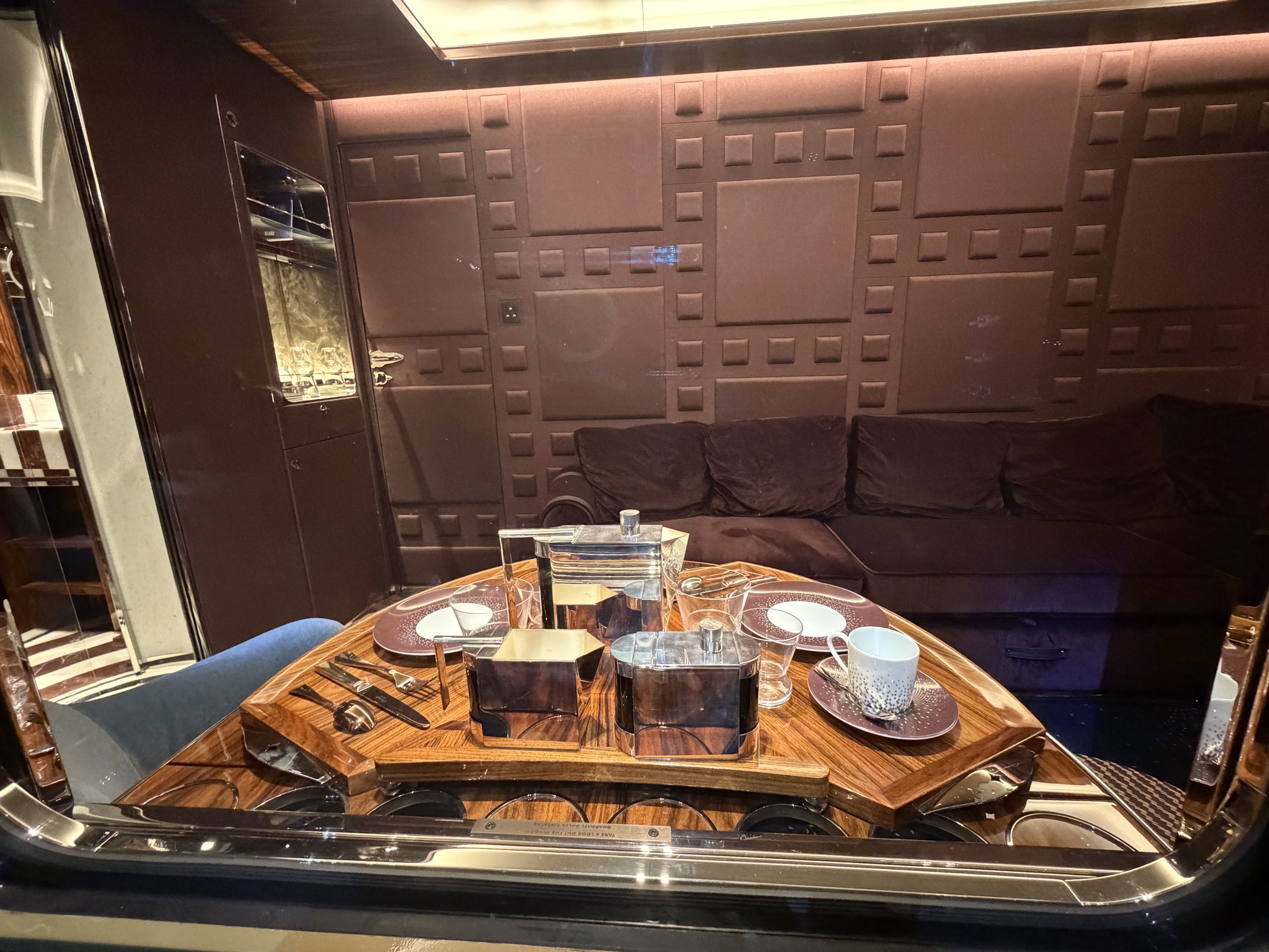Pour la nouvelle table (verre, métal), le fauteuil pivotant (métal, textile) et le service à boisson destinés au futur bar de l’Orient-Express, de 2020 à 2025, Maxime d’Angeac s’est entouré d’artisans spécialisés. Dans ce nouveau train, tout est repensé, de la poignée de porte à la petite cuiller.