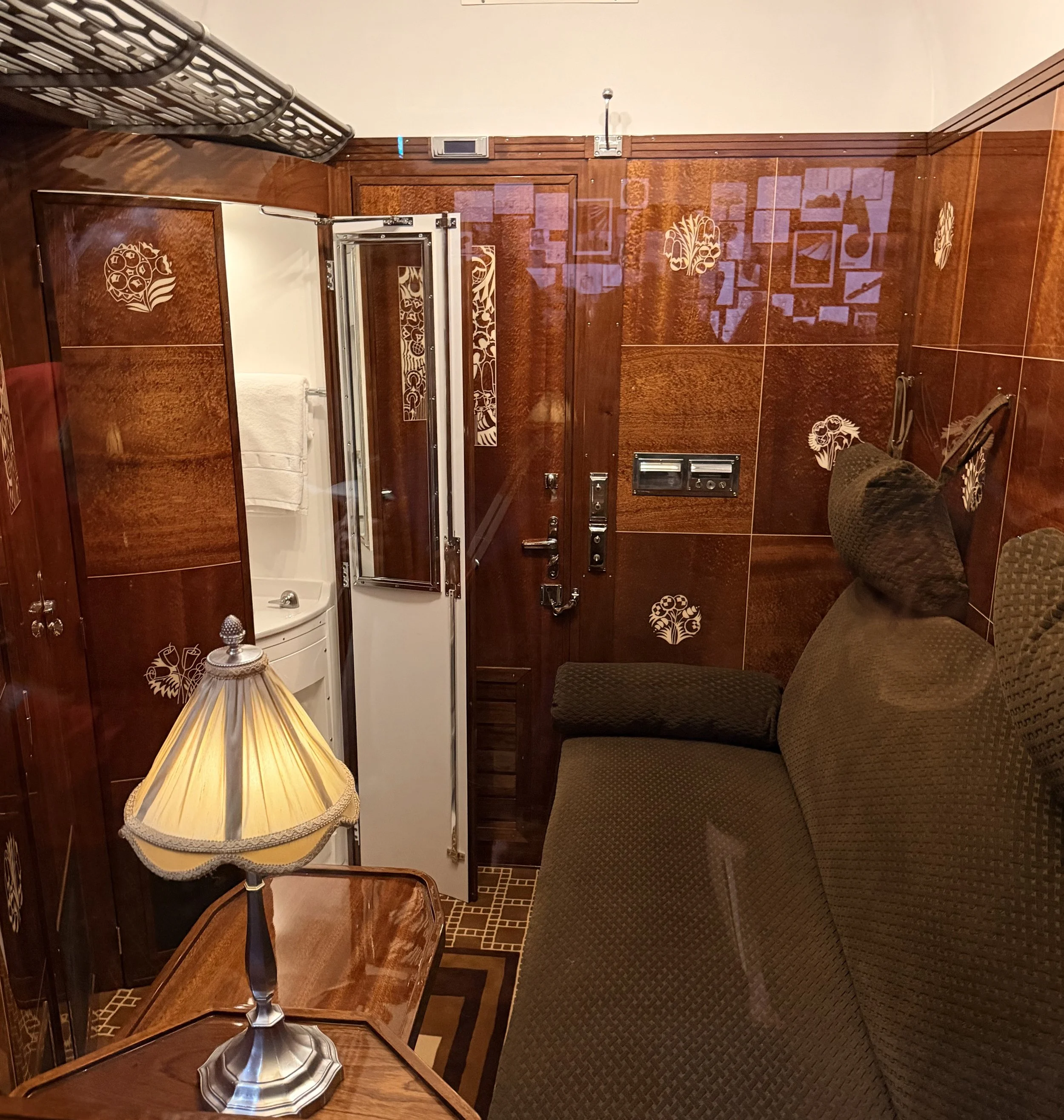 Pour les compartiments, les parois sont revêtues de bois précieux et de cuir. Les têtes de lit sont décorées de broderies de bois insérant des perles de nacre et du bronze, par J.-B. Chevalier.
