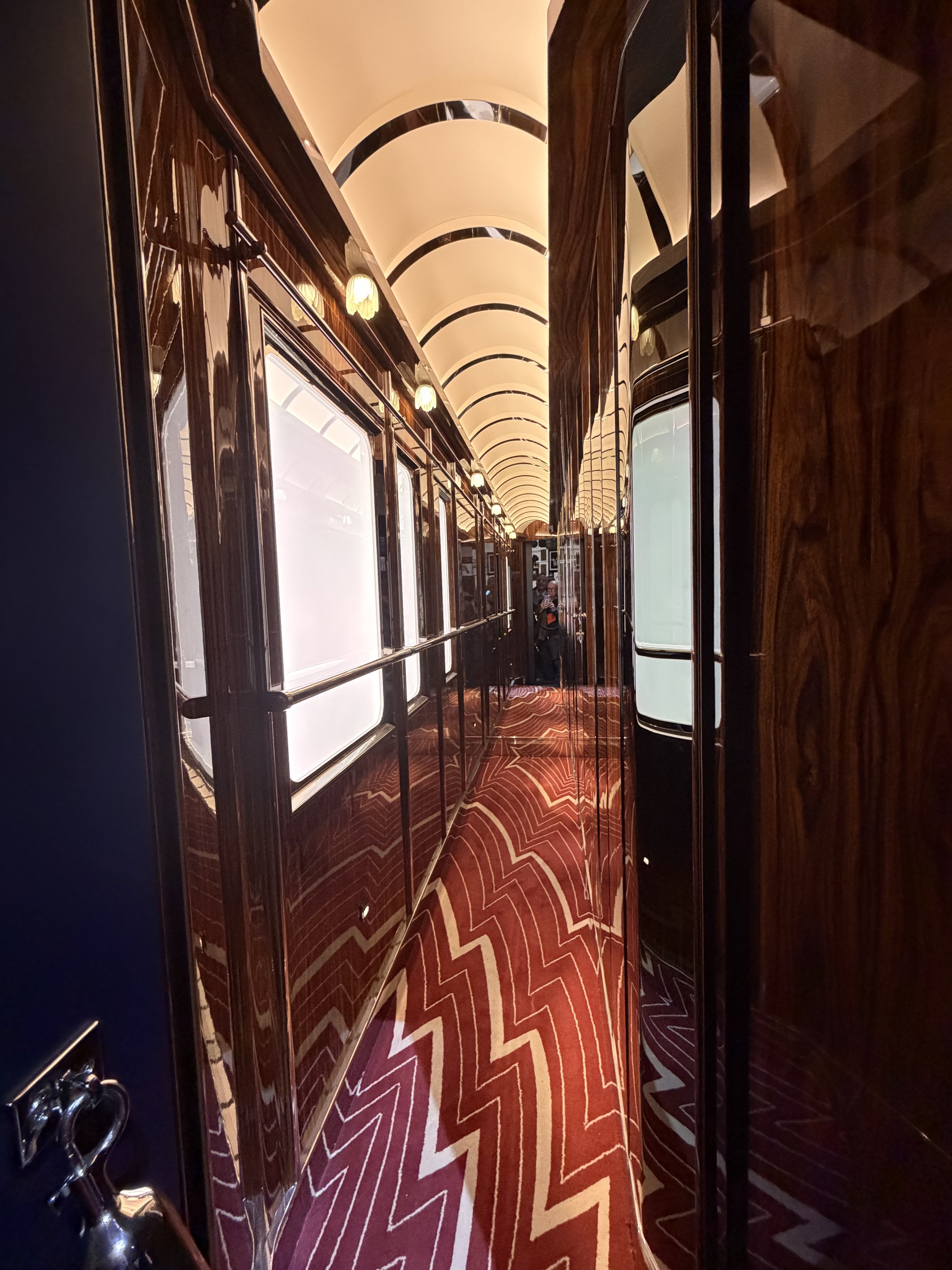 Les couloirs présentent un plafond voûté et des lampes-fleurs Lalique. On marche sur une moquette graphique.