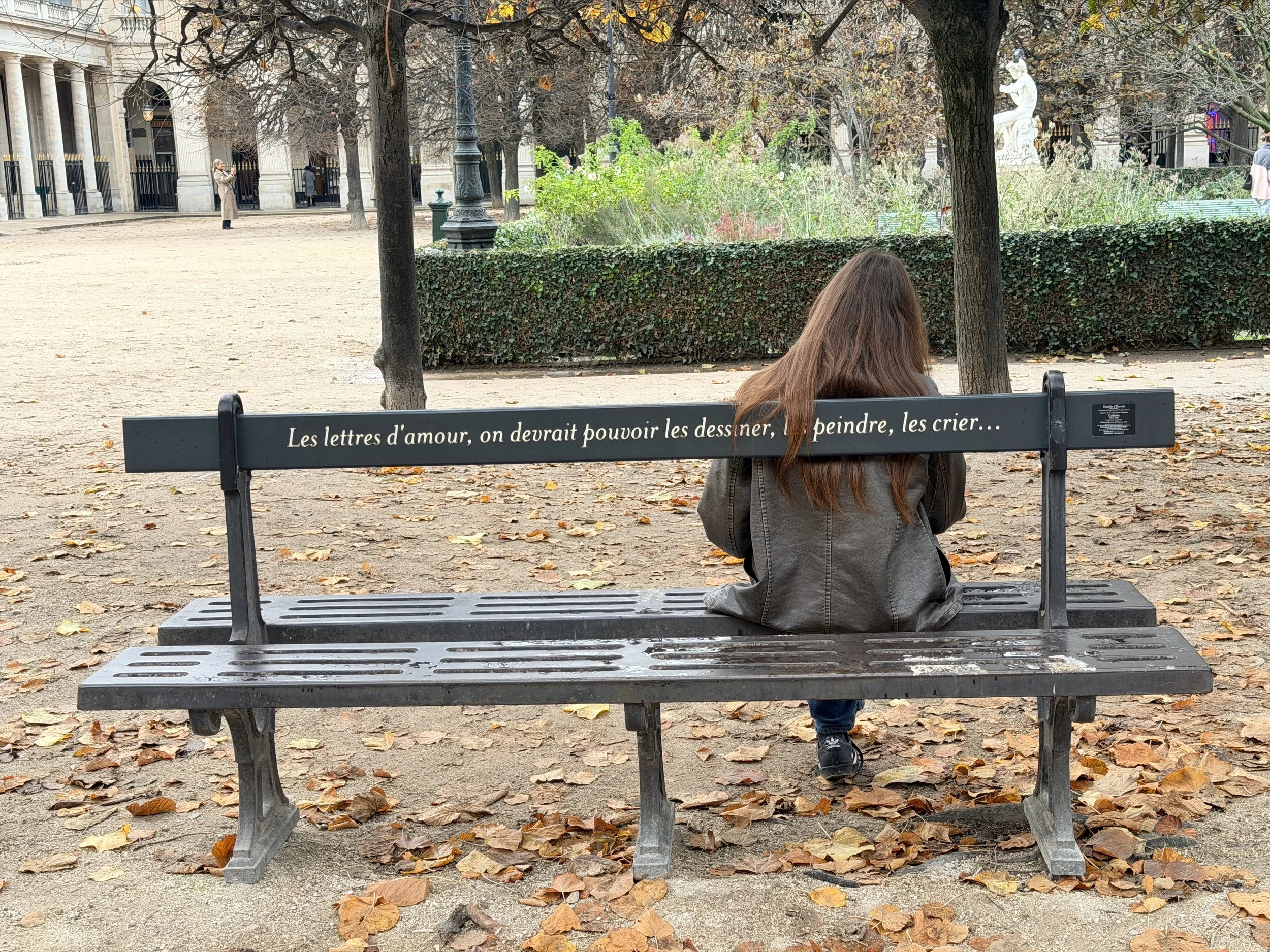 Emily in Paris ! Les bureaux de l’agence Savoir (Saison 1), devenue l’agence Grateau, sont censés se trouver Place de Valois, juste derrière le Palais Royal. Dans les jardins du Palais-Royal, Emily s’assoit sur l’un des bancs à poèmes …