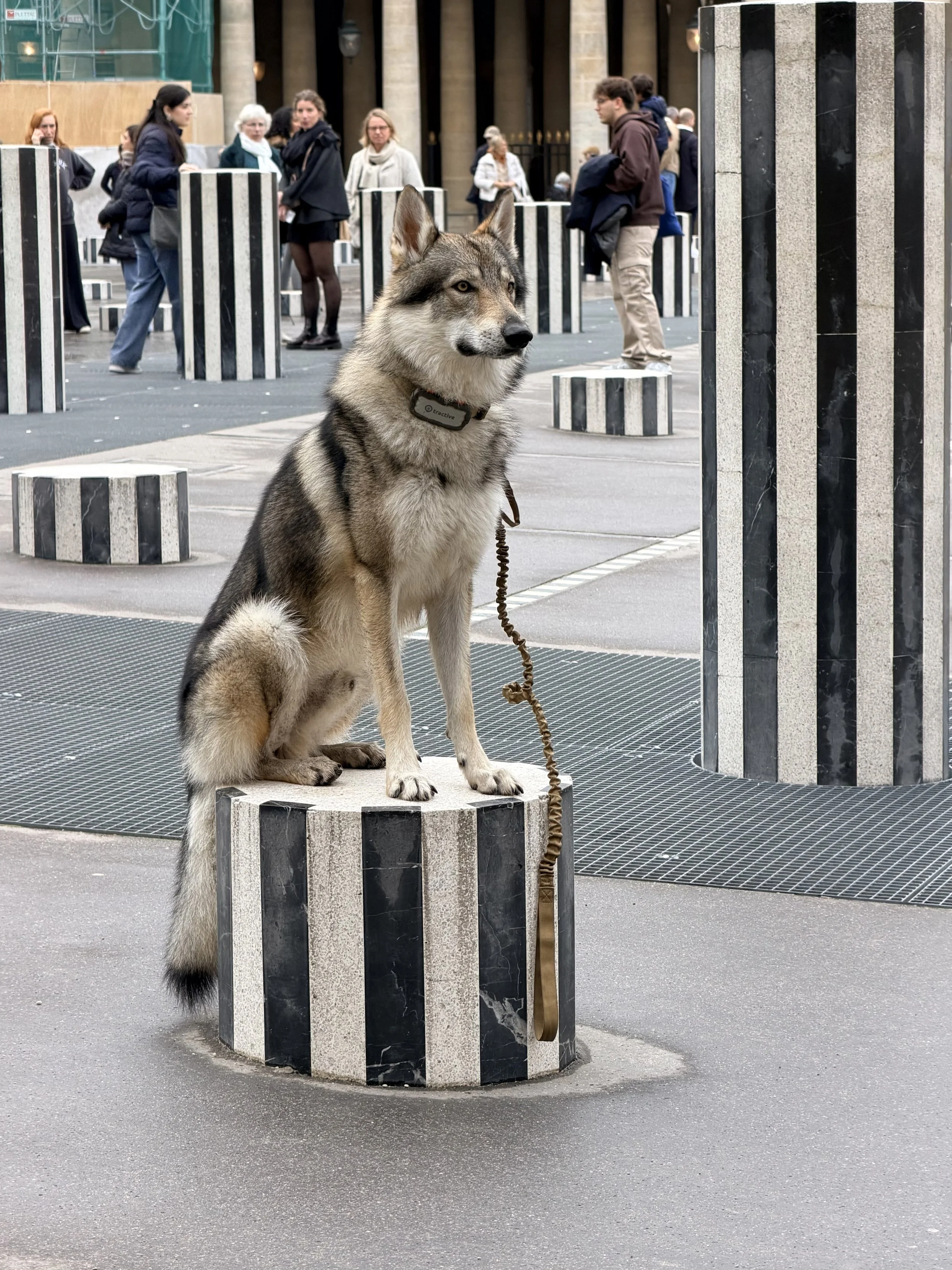 Restaurée en 2009, cette œuvre de Daniel Buren est toujours un lieu parisien très photographié. Il s’agit d’un maillage de 260 colonnes tronquées, de section octogonale, et de trois hauteurs différentes, en marbre blanc de Carrare, et en marbre blanc et noir des Pyrénées, aux rayures blanches et noires dont la largeur est toujours la même : 8,7 cm. Les rayures rappelleraient le tissu rayé des toiles de stores que l’on trouvait communément à Paris.