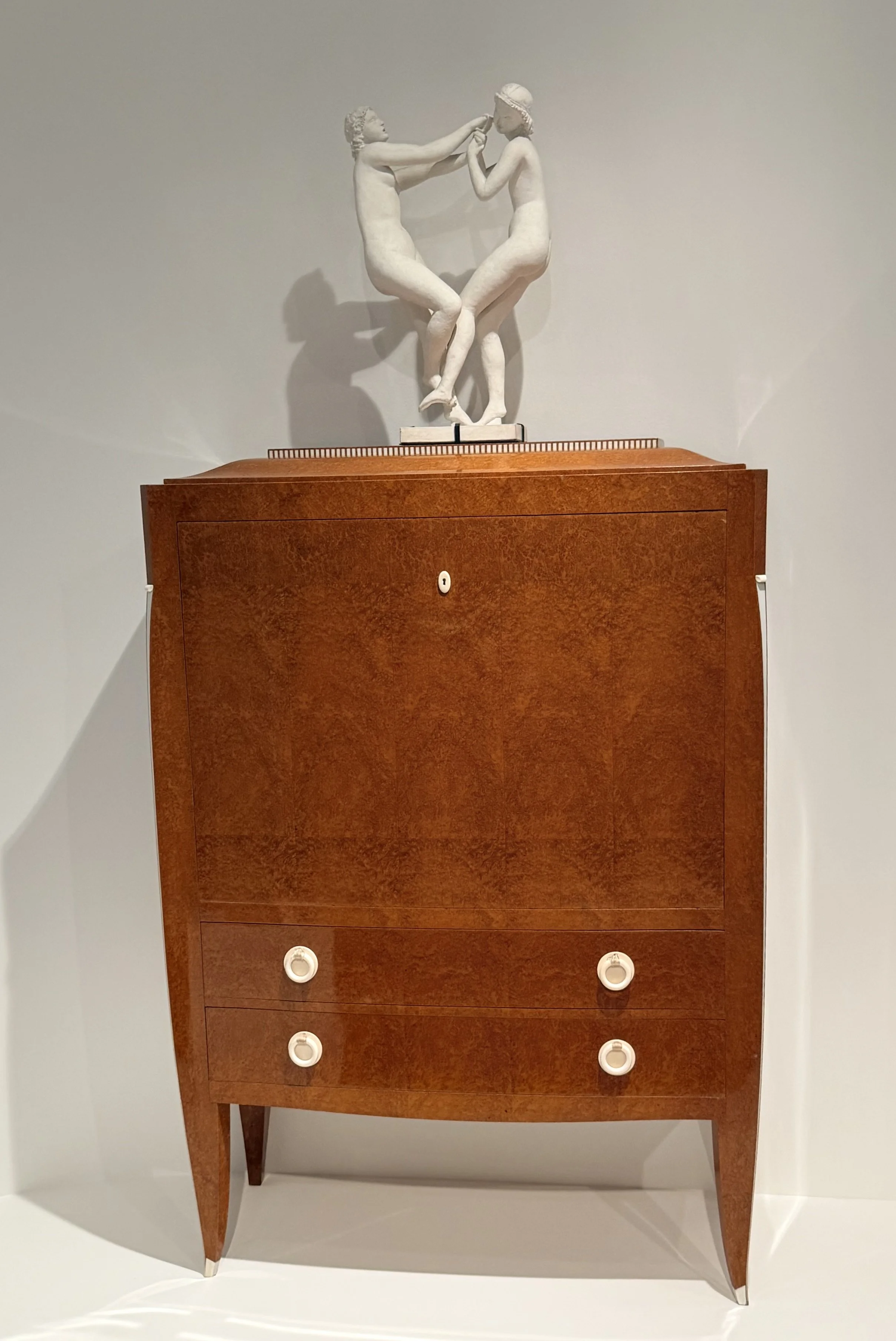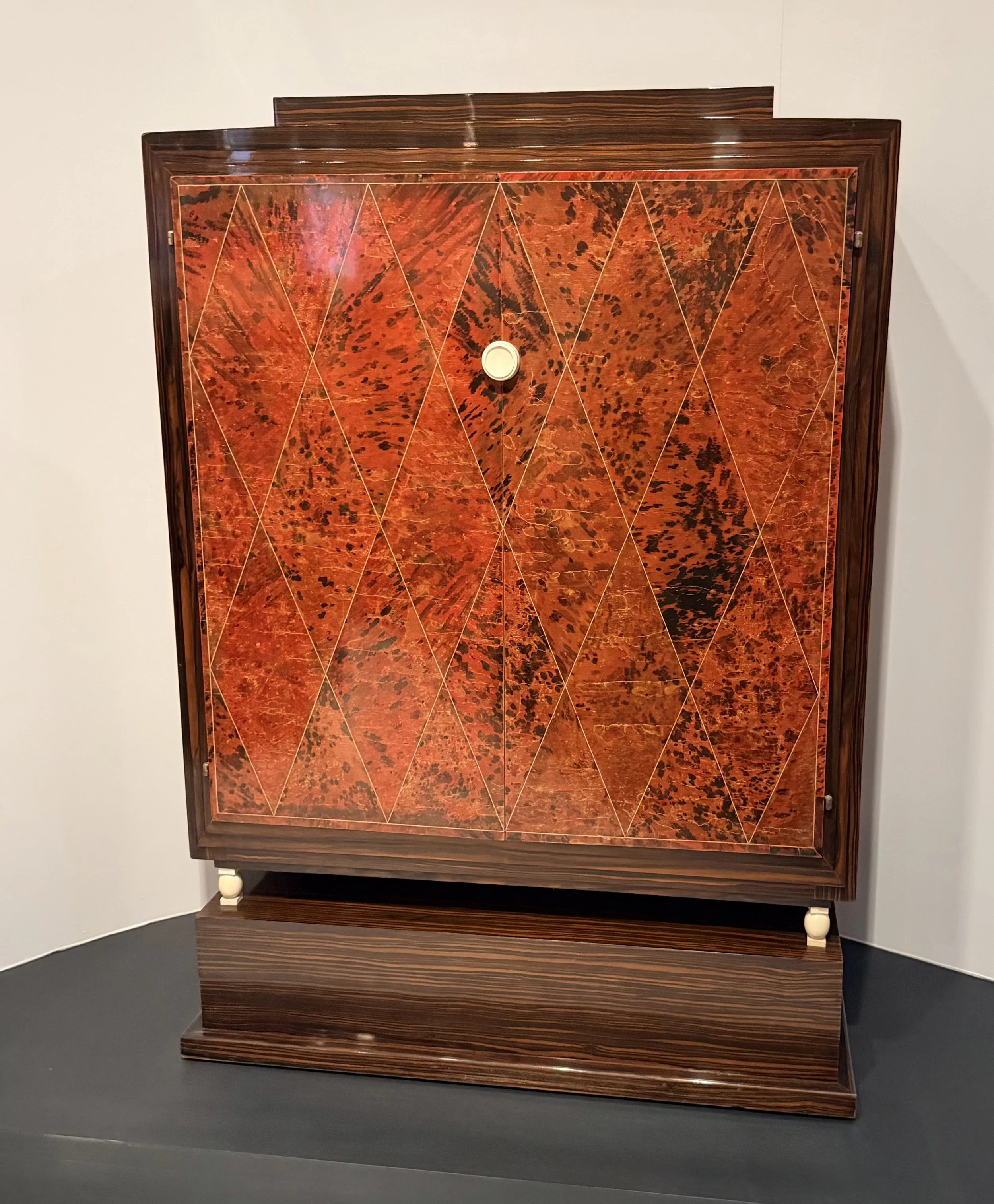 Il y a quelques années, j’ai photographié ce meuble au Musée des Années 1930 à Boulogne-Billancourt. Chaque pied, cannelé de 8 sillons, a nécessité 80 heures de travail. Placé sur le côté du meuble , il en accentue l’impression de légèreté ! Le décor en ivoire est de Maurice Pico, collaborateur de Ruhlmann, et auteur du célèbre bas-relief de la façade des Folies-Bergères à Paris.