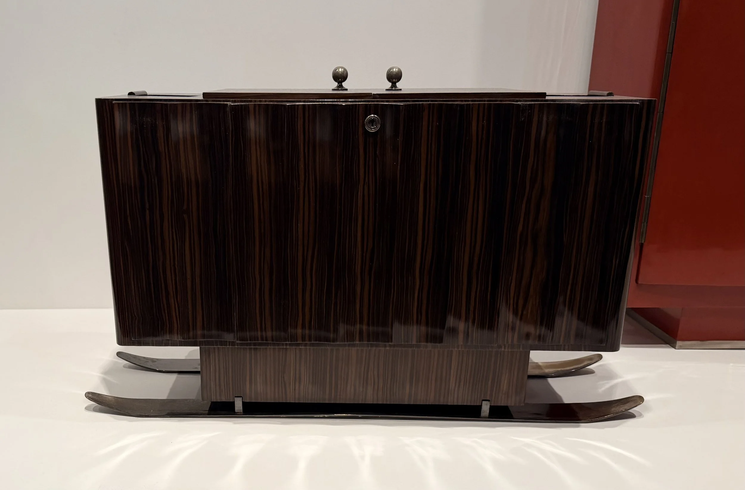 Une curiosité, ce bar à liqueurs, dit bar à skis (vers 1931), en chêne, ébène de Macassar. Ruhlmann a souhaité attirer l’attention du futur maharaja d’Indore, qui cherchait en Europe des décorateurs pour son palais indien.