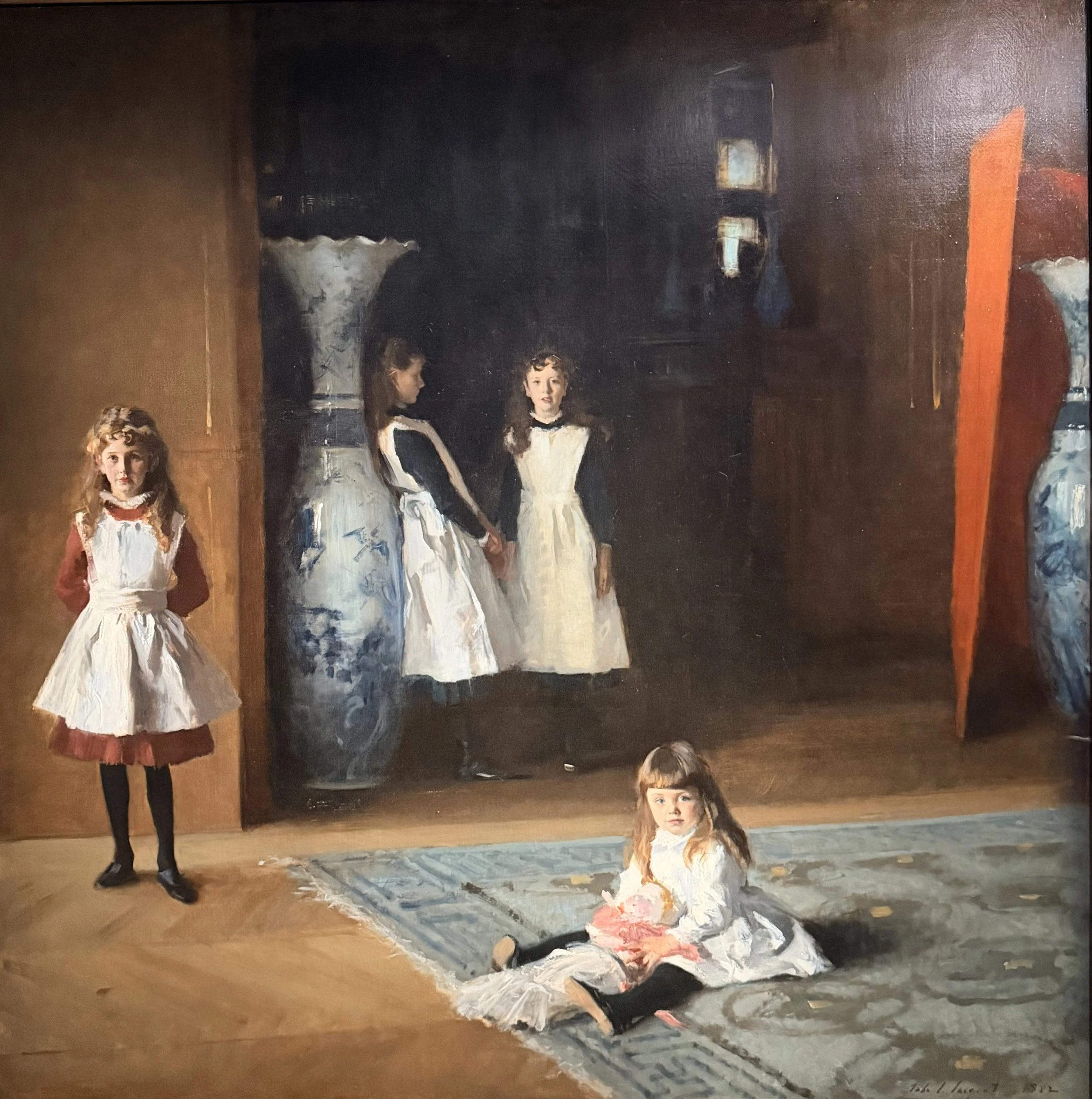 Le Museum of Fine Arts de Boston a prêté Les Filles d’Edward Darley Boit (1882). On pense aux Ménines de Velasquez. D’ailleurs, ce tableau a été exposé une fois au Musée du Prado tout à côté des Ménines. C’est lors d’un voyage en Espagne que Sargent a été fasciné par l’œuvre de Velasquez. La famille Boit comptait parmi les riches Américains expatriés à Paris. Le père peignait et était ami de Sargent. Les petites filles semblent ne pas communiquer entre elles, telles quatre Alice au pays des merveilles, à des âges différents. Avez-vous vu le petit trait blanc sur les chaussures des deux filles dans le fond ?