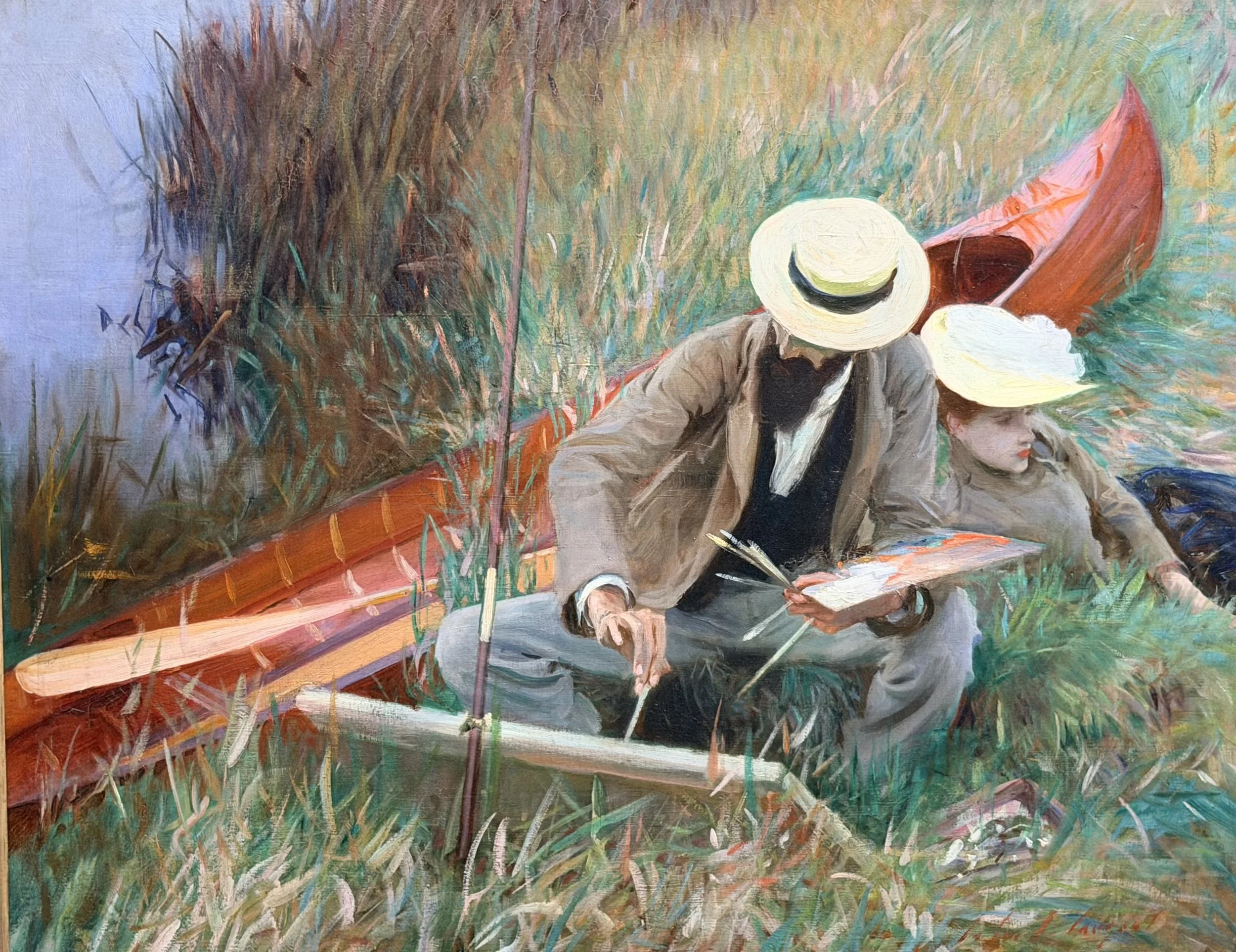Paul Helleu dessinant auprès de son épouse, 1889, Brooklyn Museum of Art, New York. On est ici à Fladbury, dans le Worcestershire, où Paul Helleu et sa compagne Alice Guérin sont venus rendre visite à Sargent, qui a fait connaître ce peintre au Royaume-Uni et aux USA.