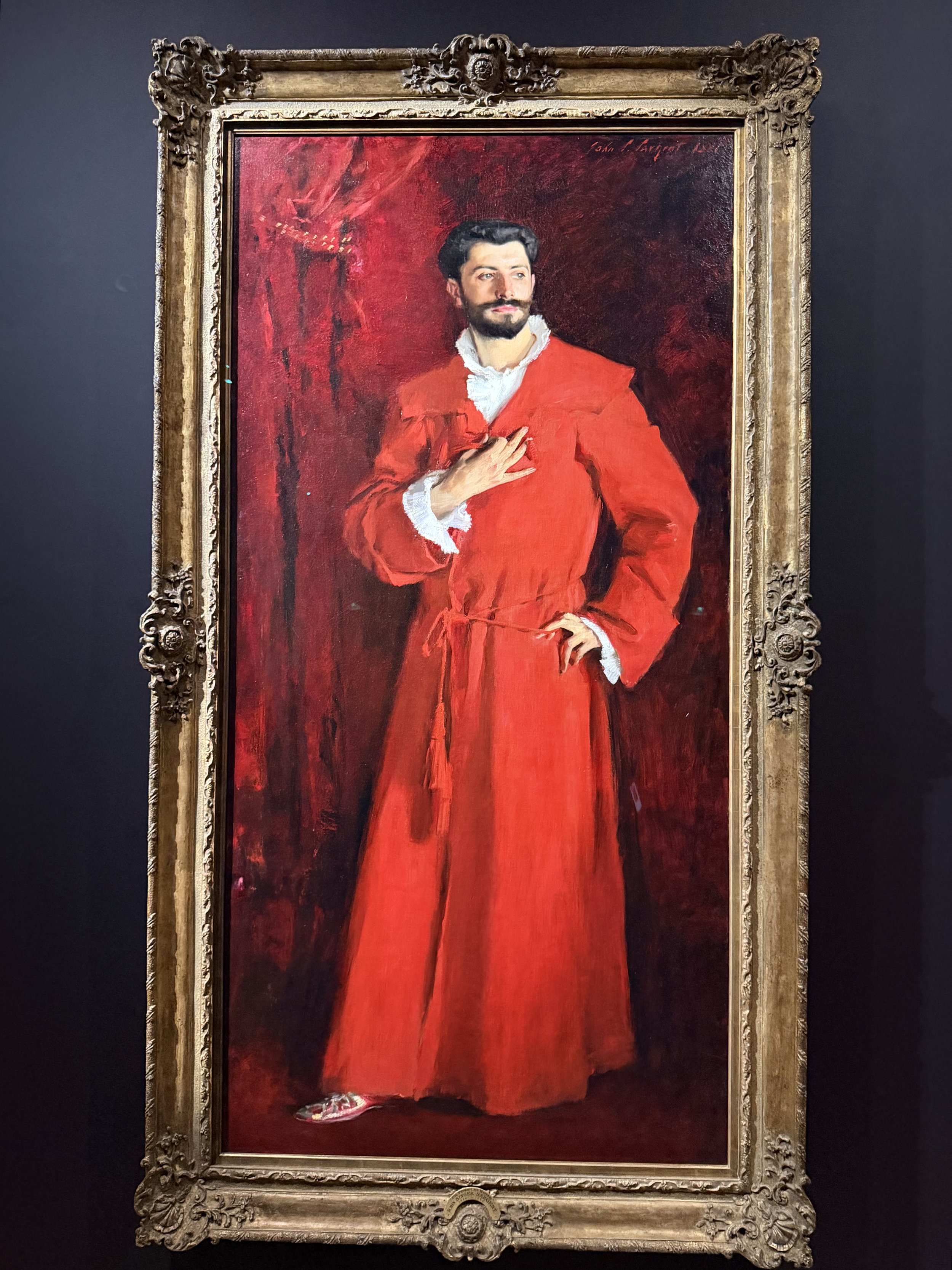 Un portrait audacieux pour l’époque, assez féminin, le contraire de Madame X : le sujet dans sa robe de chambre … rouge sur rouge, les doigts effilés des mains du docteur, trop audacieux pour être présenté au Salon de Paris. Éblouissant. On dirait un prince de la Renaissance…