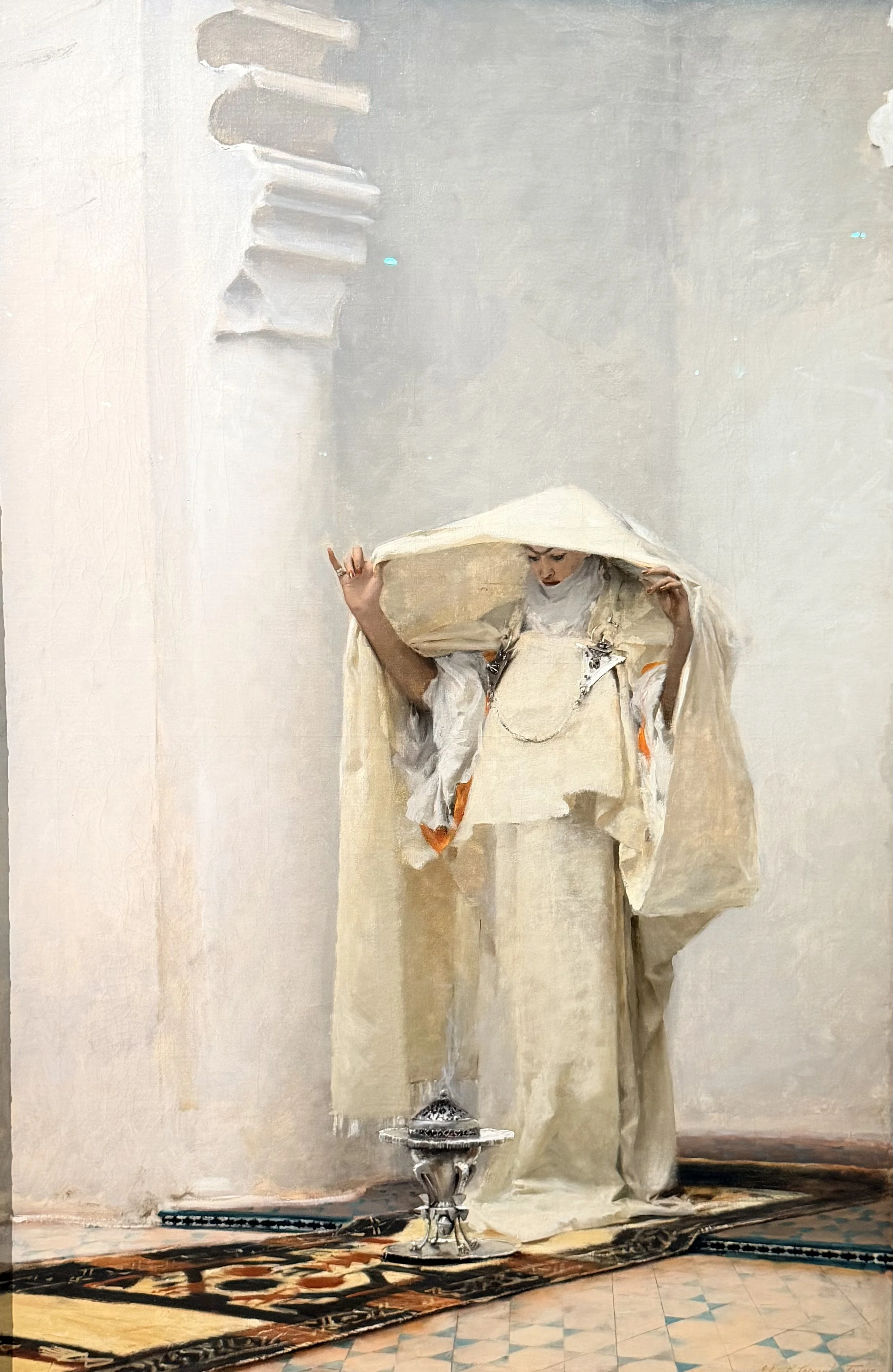 Comment représenter la couleur blanche ? Tout en nuances différentes, ici, dans Fumée d’ambre gris (Smoke of ambergris) (1880), Clark Art Institute, Williamstown, Massachusetts. Les visiteurs restent longtemps, absorbés par cette femme de Tanger qui respire le parfum montant de l’encensoir, de l’ambre gris, une concrétion intestinale du cachalot, et d’une grande valeur marchande pour son odeur très forte, rappelant celle du tabac, utilisée en parfumerie, mais souvent remplacée par un substitut de synthèse … Commencée à Tanger, la toile fut terminée dans l’atelier de Sargent à Paris.