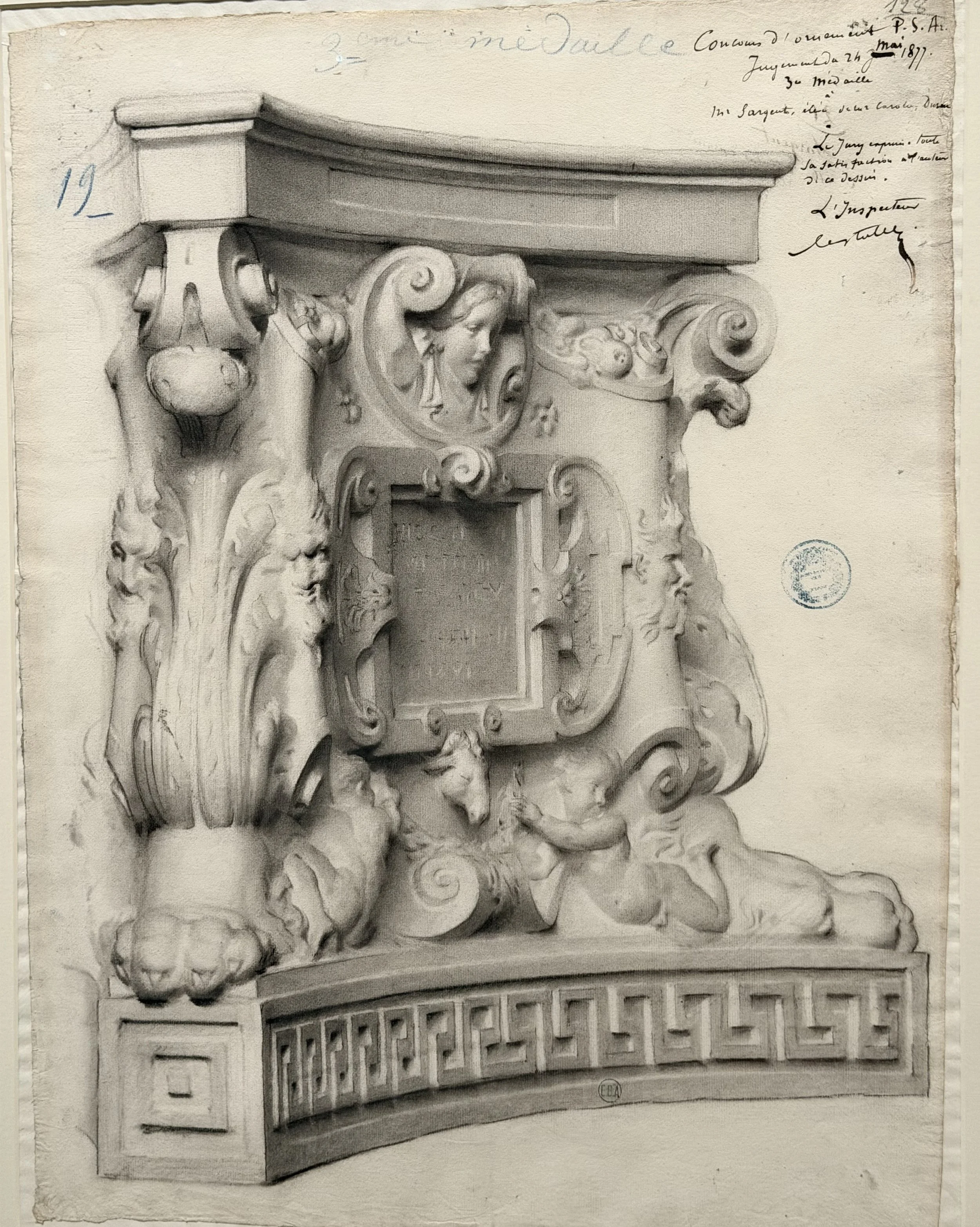 Dessin d’ornement, 1877. Un incroyable dessin au fusain et crayon noir sur papier, d’un piédestal Renaissance, réalisé à 21 ans! On dirait un dessin en 3D, qui lui vaut le 2e prix à l’école des beaux-arts, une première pour un étudiant américain, où il étudie depuis son arrivée à Paris en 1874. Avez-vous vu la mention manuscrite ? Élève de Carolus-Duran…