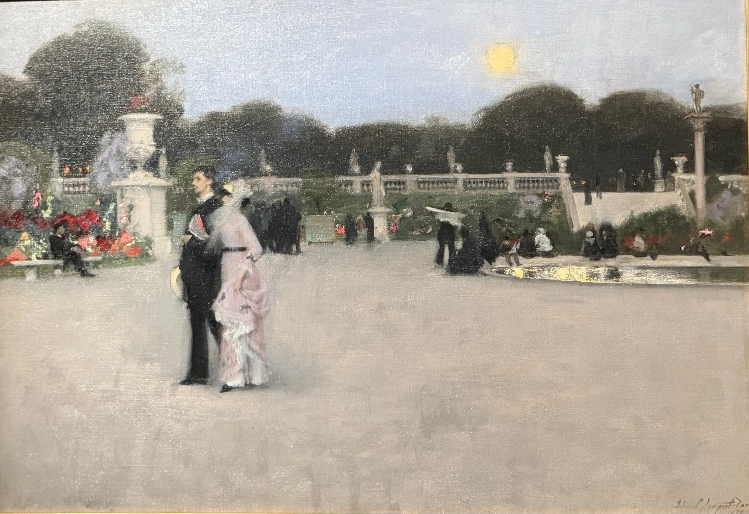 Le Museum of Fine Arts de Philadelphie a prêté Dans le Jardin du Luxembourg (1879). Son premier atelier se trouvait tout près, rue Notre-Dame-des-Champs. Avez-vous remarqué les reflets de la lune dans l’eau des bassins ?