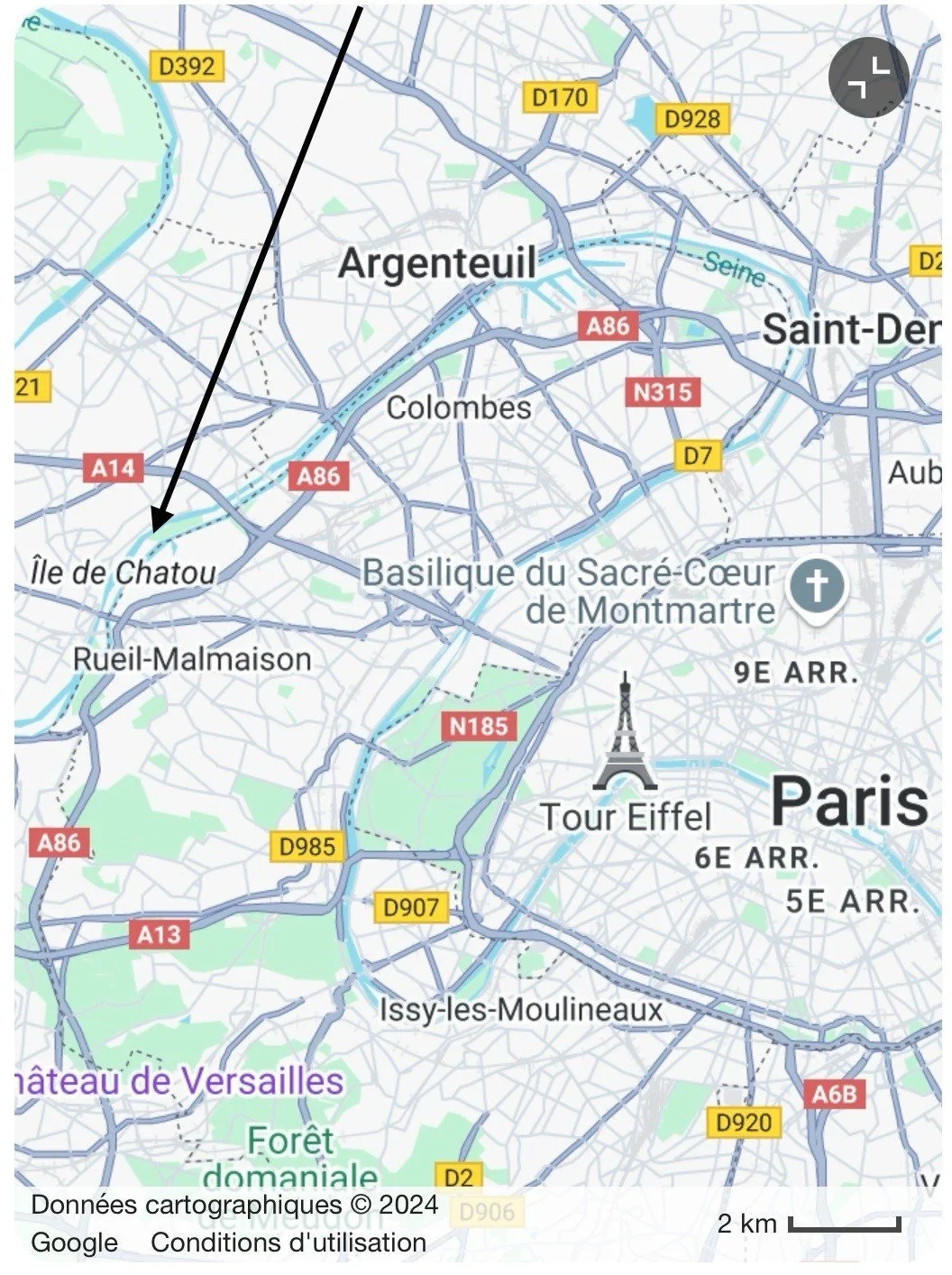 Sur l’île fluviale de Chatou, de nos jours également appelée île des Impressionnistes, sur la Seine, dans le Département des Yvelines, face à Rueil-Malmaison. Dans les années 1860, les Parisiens viennent y faire du canotage, se promener, peindre, déjeuner, comme Claude Monet, Auguste Renoir, Gustave Caillebotte et Guy de Maupassant.