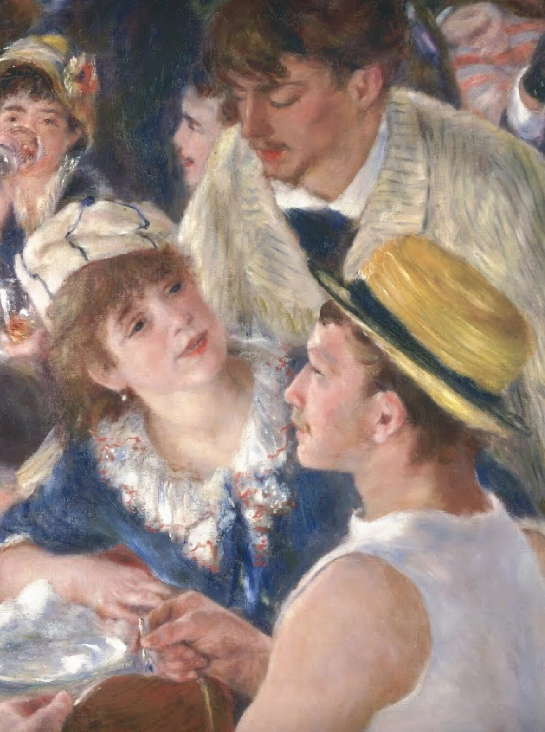 En bas à droite, assis, en marcel, Gustave Caillebotte, mécène et collègue-peintre de Renoir, représenté plus jeune, et le journaliste Adrien Maggiolo bavardent avec une autre actrice de l’époque, Angèle Legault.