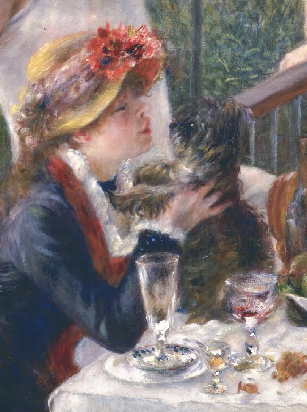 Enfin, assise à gauche avec le petit chien, Aline Charigot, modèle de Renoir, sa future épouse et mère de leur fils Pierre.