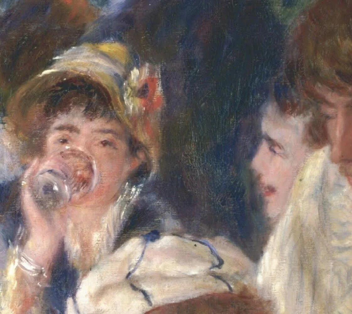 Autre actrice, au centre du tableau, en train de boire, Ellen Andrée, qui a été le modèle d’Edgar Degas dans sa célèbre ”Buveuse d’absinthe”. A sa gauche, le profil d’un homme, à peine visible. Et si c’était Renoir qui s’était rajouté lui-même, désireux d’éviter aux convives d’être 13 à table ?